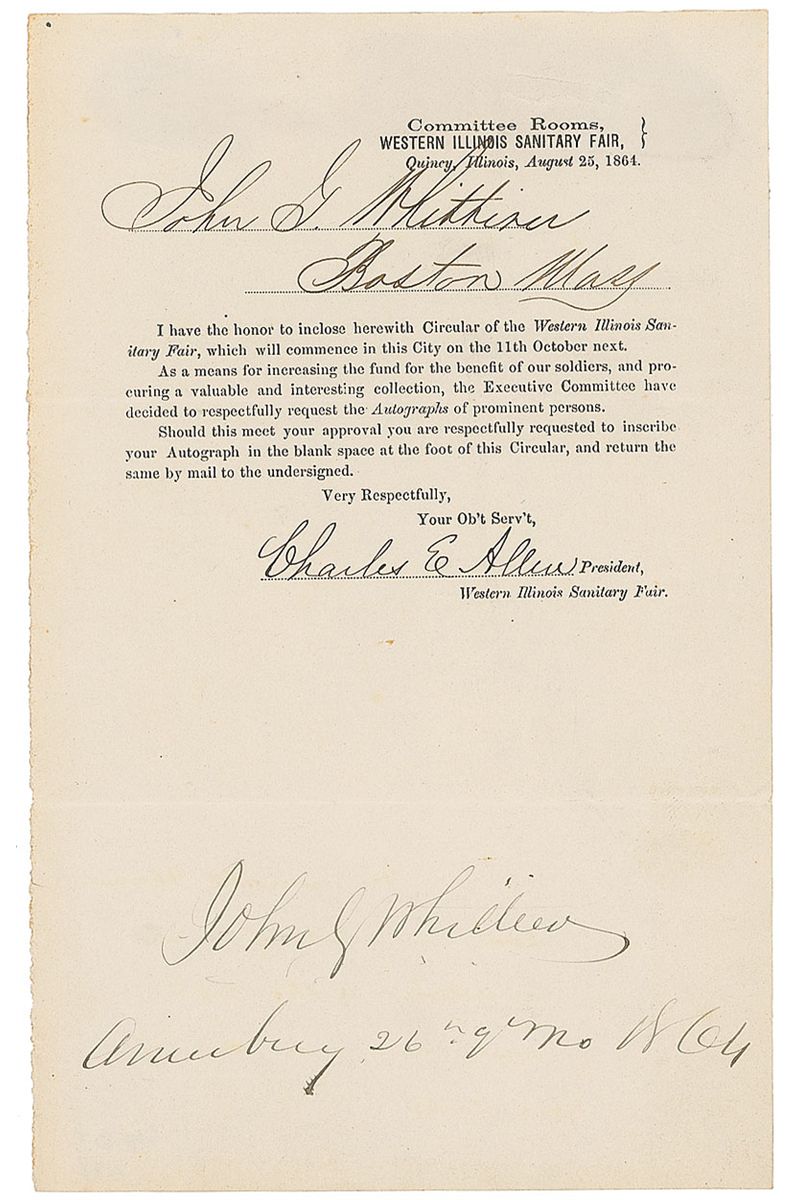 American Quaker poet and abolitionist (1807–1892) best known for such works as ‘Barbara Frietchie’ and ‘Maud Muller,’ which includes the immortal line, ‘For of all sad words of tongue or pen, The saddest are these: It might have been!’ Civil War–dated DS, signed “John G. Whittier, Amesbury, 26th 9mo 1864,” one page, 5 x 8, August 25, 1864. Whittier signs at the conclusion of an autograph request document issued by the Western Illinois Sanitary Fair Committee. In part: “As a means for increasing the fund for the benefit of our soldiers, and procuring a valuable and interesting collection, the Executive Committee have decided to respectfully request the Autographs of prominent persons.” In fine condition, with a small, unobtrusive tear to the upper border.