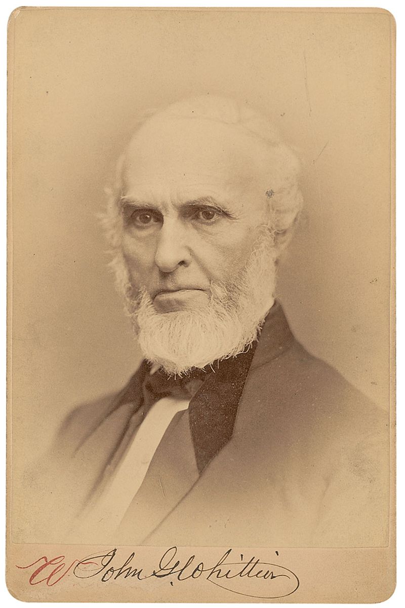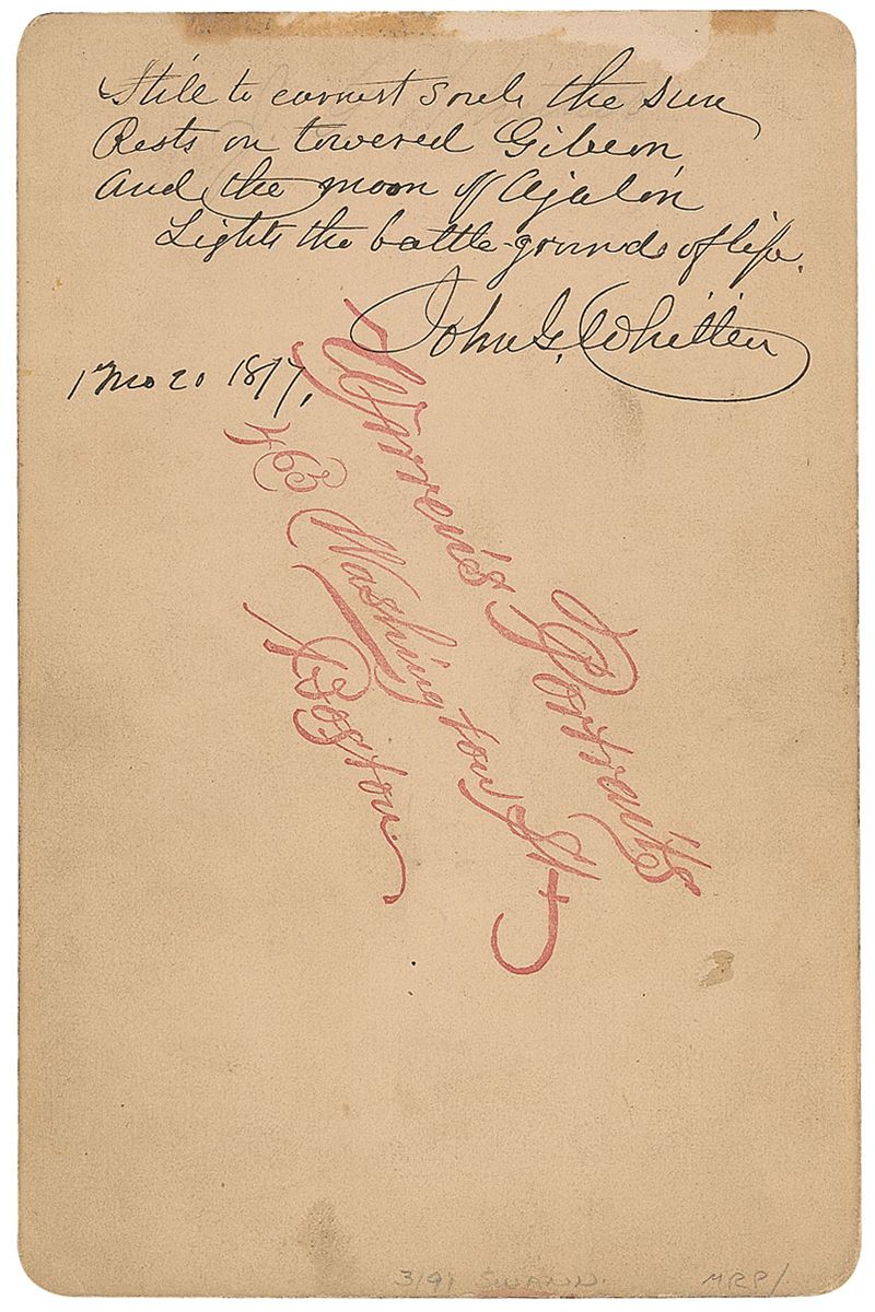 Original 4.25 x 6.5 cabinet photo by Warren’s Portraits of Boston, signed in the lower border in black ink, “John G. Whittier.” On the reverse, Whittier adds an AQS from The Bridal of Pennacook: “Still, to earnest soul, the sun; Rests on towered Gibeon, And the moon of Ajalon, Lights the battle-grounds of life. John G. Whittier.” Some light rubbing and spotting to image, trivial surface loss to bottom border, and some scattered light soiling and surface loss to reverse, otherwise fine condition.