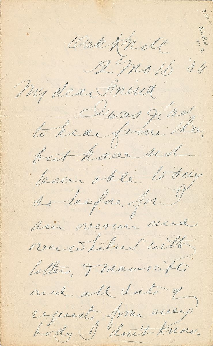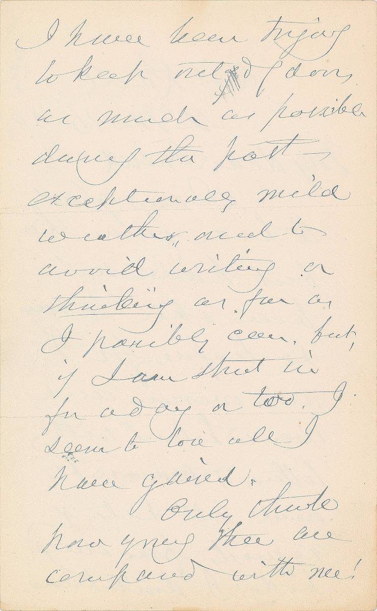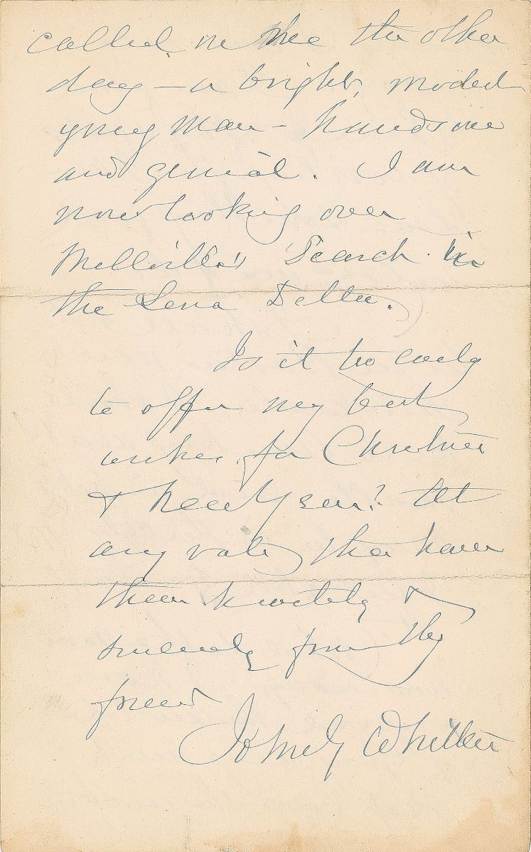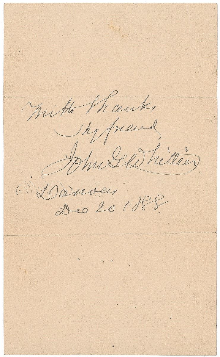 Two items: an ALS signed “John G. Whittier,” four pages on two adjoining sheets, 4.75 x 7.75, in part: “I was glad to hear from thee, but have not been able to say so before, for I am overrun and overwhelmed with letters, & manuscripts, and all sorts of requests from everybody I don’t know…I shall not be in Boston much this winter. I shall be in Amesbury next month”; and an ink signature, “With thanks, my friend, John G. Whittier, Danvers, Dec. 20, 1888,” on an off-white 4.265 x 7 sheet. In overall very good to fine condition, with light edge toning and splits along folds.