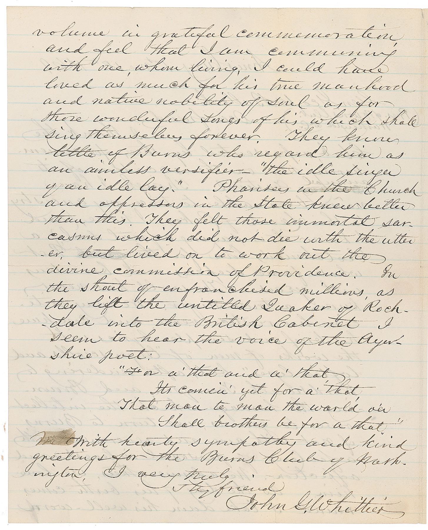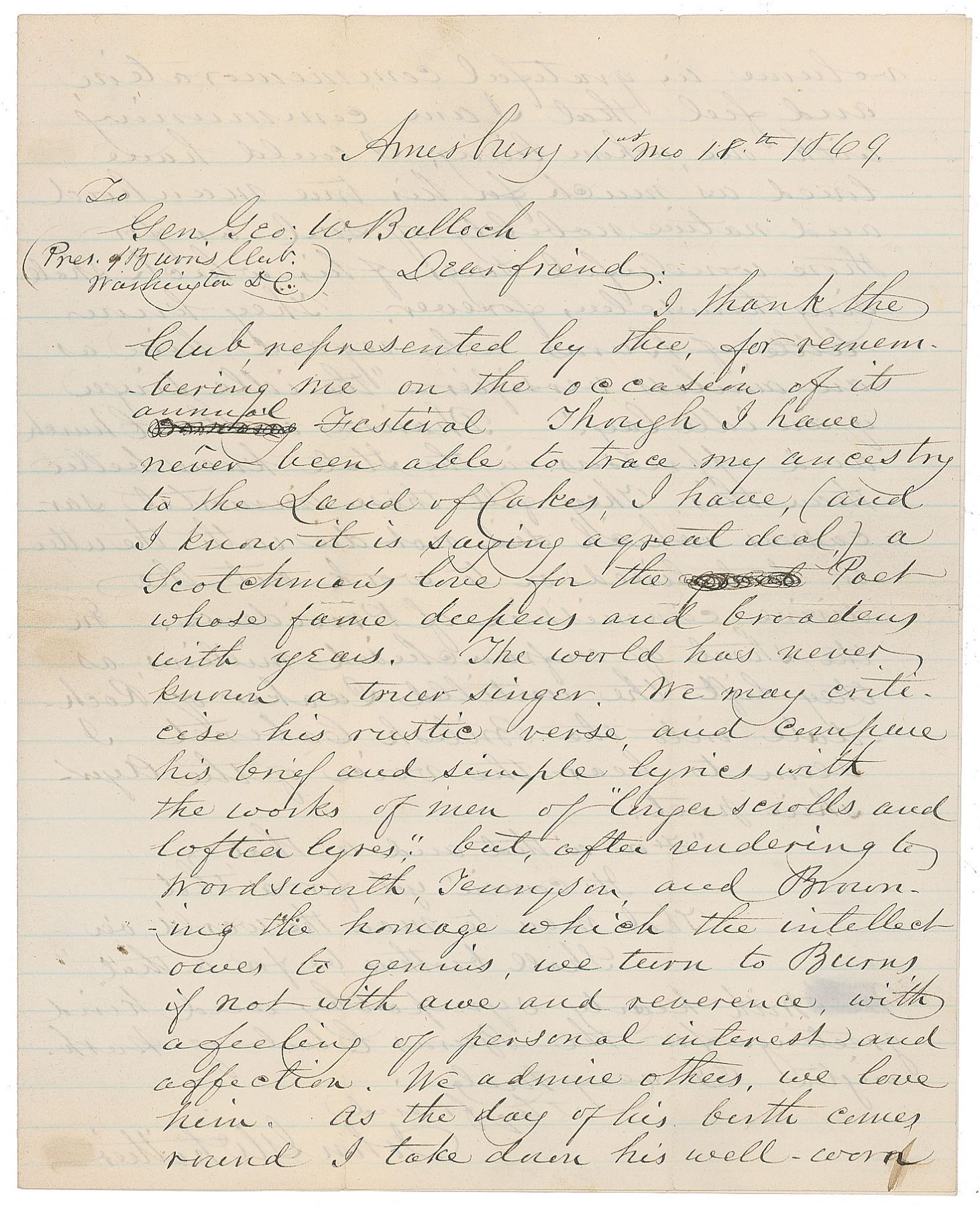 ALS signed “John G. Whittier,” one page both sides, 8 x 10, January 18, 1869. Letter to George W. Ballock, president of the Burns Club of Washington, DC, in part: "I thank the Club, represented by thee, for remembering me on the occasion of its annual Festival. Though I have never been able to trace my ancestry to the Land of Lakes, I have, (and I know it is saying a great deal), a Scotchman's love for the Poet whose fame deepens and broadens with years. The world has never known a truer singer. We may criticise his rustic verse, and compare his brief and simple lyrics with the works of men 'longer scrolls and loftier lyres'; but, after rendering to Wordsworth, Tennyson, and Browning the homage which the intellect owes to genius, we turn to Burns if not with awe and reverence, with a feeling of personal interest and affection. We admire others, we love him. As the day of his birth comes round I take down his well-worn volume in grateful commemoration, and feel that I am communing with one, when living, I could have loved as much for his true manhood and native nobility of soul as for those wonderful songs of his which shall sing themselves forever." In fine condition, with small splits to edges. Accompanied by the original mailing envelope addressed in Whittier's hand.