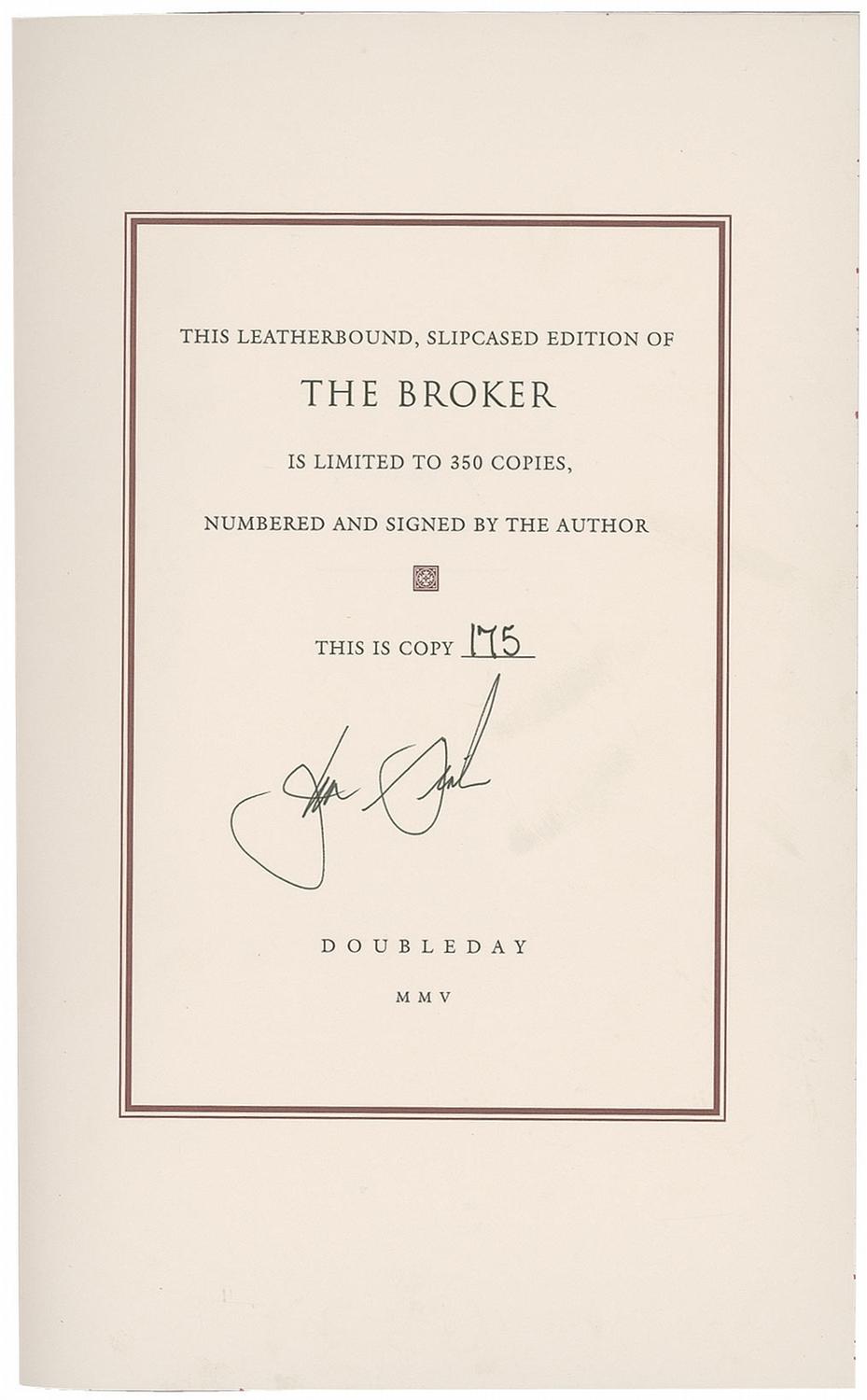 Signed book: The Broker. Limited edition first edition, first printing of 350 copies (this copy No. 175). NY: Doubleday, 2005. Hardcover with slipcase, 6.5 x 9.5. Signed on the limitations page by Grisham. In very fine condition, with some light wear to the slipcase.