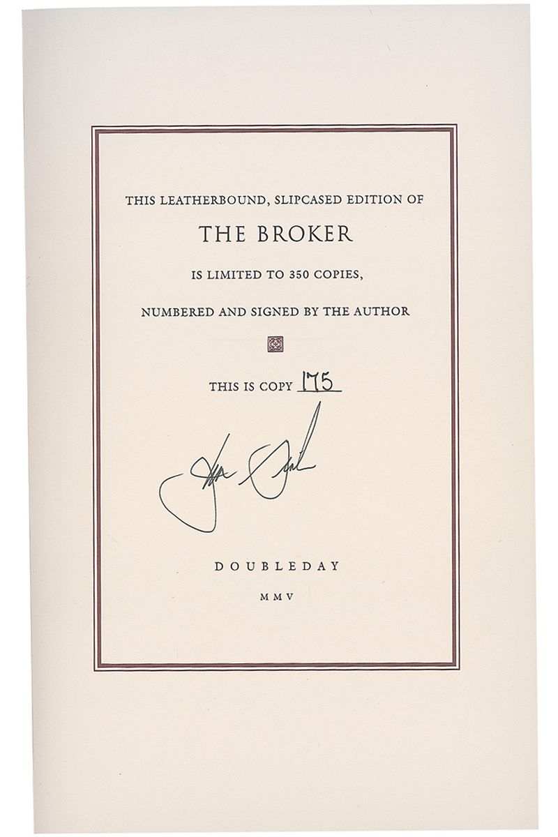 Signed book: The Broker. Limited edition first edition of 350 copies (This being No. 175), first printing. NY: Doubleday, 2005. Hardcover with dustjacket, 6.5 x 9.5, 357 pages. Signed on the limitations page in black ink. In very fine condition.