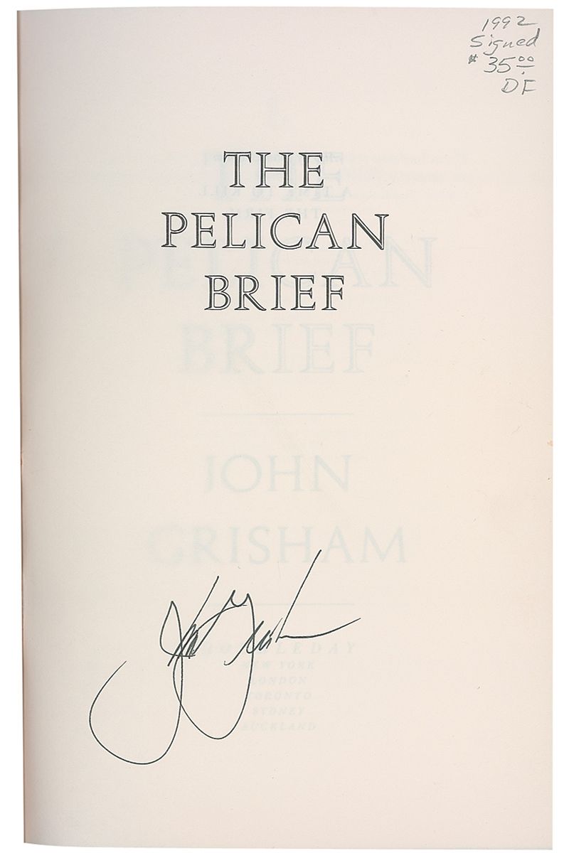 Signed book: The Pelican Brief. First edition, later printing. NY: Doubleday, 1992. Hardcover with dustjacket, 6.5 x 9.5, 371 pages. Signed on the half title page in black ink. In fine condition, with pencil notations to top of signed page.