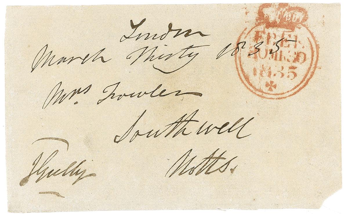Heavyweight champion of England (1783-1863), one of the earliest champions in the history of boxing, later a member of British Parliment. Free-franked address panel, trimmed to 5 x 3, addressed in another hand to “Mrs. Fowler, Southwell, Motts,” and dated at the top, “London, March Thirty 1835.” Franked in the lower left corner, “J. Gully.” In fine condition, with some mild toning and soiling, and missing lower right corner tip. Rare in any form. RRAuction COA.