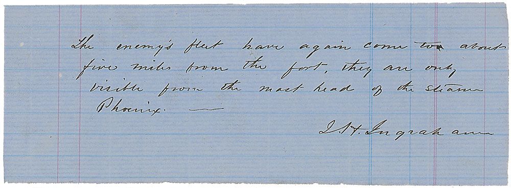 Midshipman who resigned from the US Navy to join the Confederacy. ANS signed “J. H. Ingraham,” one page, lightly-lined, 7.5 x 2.75, no date. Note regarding the Union Navy. In full: “The enemy’s fleet have again come to about five miles from the fort, they are only visible from the mast head of the steamer Phoenix.” Professionally inlaid into a slightly larger off-white sheet. In fine condition.