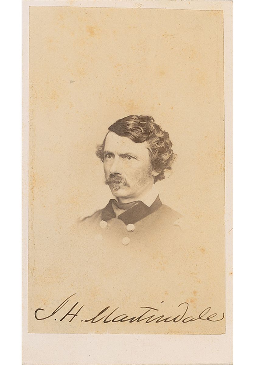 Union officer and politician (1815–1881) who participated in the Peninsula Campaign as well as the Bermuda Hundred Campaign, the Battle of Cold Harbor, and the Siege of Petersburg. Original 2.25 x 4 carte-de-visite photo by R. W. Addis of Washington, D. C., signed below the image in black ink, “J. H. Martindale.” In fine condition, with a bit of scattered light toning to image.