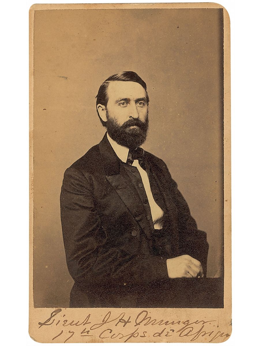 Original 2.25 x 4 carte-de-visite photo by Kertson and Barler of New York, signed in the lower border in black ink, “Lieut. J. H. Munger, 17th Corps de Afrique.” Some mild toning to borders and pencil notation on reverse, otherwise fine condition.
