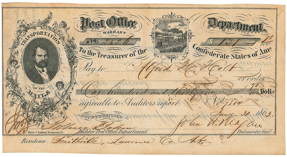Texas politician (1818–1905) who served as Postmaster General of the Confederacy. Partly-printed and ornate war-dated DS, one page both sides, 8.75 x 4.5, January 31, 1863. Confederate Post Office pay order issued to Alfred H. Holt for $131.78, signed at the conclusion by Reagan as Postmaster General. In very good condition, with several vertical folds and creases, one through a single letter of signature, scattered light toning, mild creases, and show-through from writing on reverse.