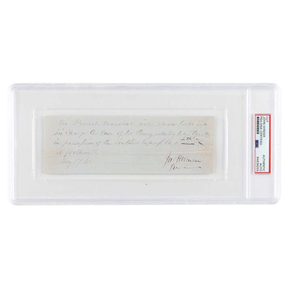 Manuscript DS, signed “Jno. H. Winder,†one page, 7.5 x 2.5, May 5, 1862. In part: "The Provost Marshall will please take into his charge the case of Mr. Pearry, relating to his trunk in possession of the Southern Express Co." In fine condition. Encapsulated in a PSA/DNA authentication holder.
