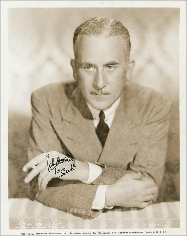 Actor (1880–1947) best remembered as Seth Lord, father of Tracy Lord (Katharine Hepburn) in the film The Philadelphia Story. Vintage sepia glossy 8 x 10 Paramount promotional photo of Halliday posing casually, signed and inscribed in-person in fountain pen “John Halliday to Saul.” Reverse of photo bears collector’s stamp date of December 28, 1936, the date the signature was acquired. In fine condition, with a central vertical streak through image, and a few light surface marks. Reverse of photo bears collector’s stamp date of March 25, 1936, the date the signature was acquired. Saul Goodman Collection.