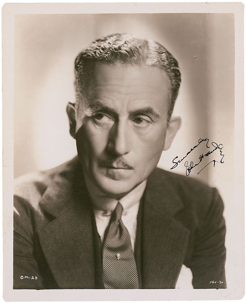 Actor (1880–1947) best remembered as Seth Lord, father of Tracy Lord (Katharine Hepburn) in the film The Philadelphia Story. Vintage glossy 8 x 10 photo, signed in fountain pen, “Sincerely, John Halliday.” Some scattered light creases and surface marks, and a couple small tears to vertical edges, otherwise fine condition.