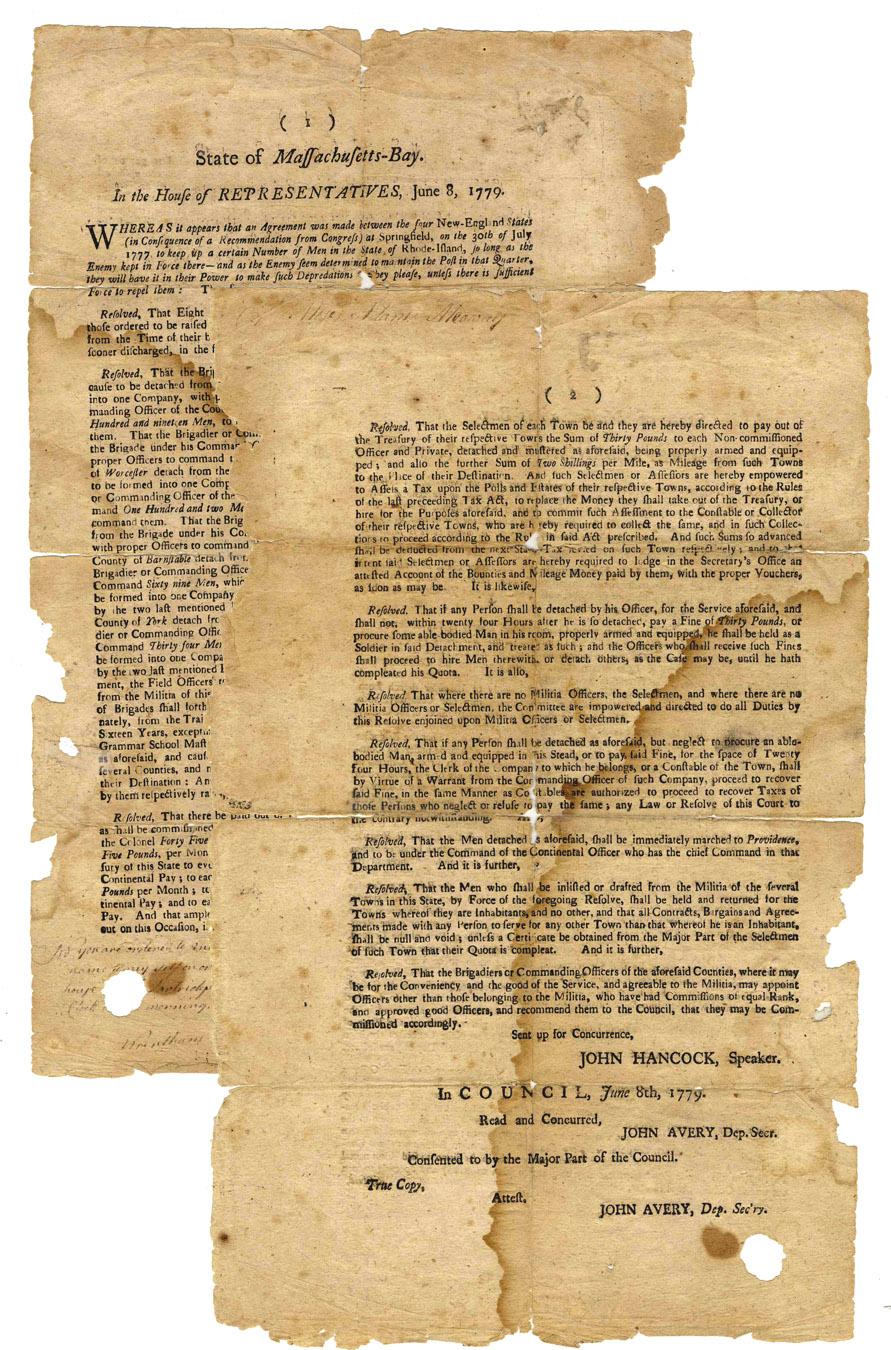 Massachusetts Bay House of Representatives broadside authored by John Hancock dated 8 June 1779. Document concerns a resolution to send 800 men from various counties in Massachusetts to help repel the British in Rhode Island, ''...as the enemy seems determined to maintain a post in that quarter...'' Bottom of second page contains the printed signature of John Hancock. 2pp. document measures 8.5'' x 14.75''. Wear to edges and along foldlines. Toning throughout and staining to large part of lower right side. Overall, fair condition.