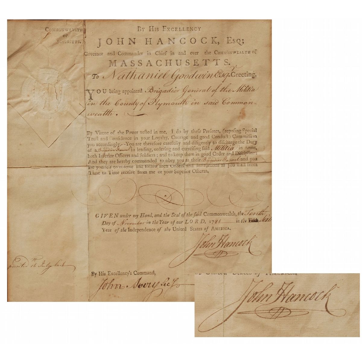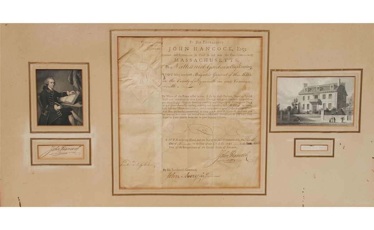 Rare, Original DS for Nathaniel Goodwin From John Hancock. Signed, Sealed and Dated 1781. The Letter States that John Hancock Appointed Nathaniel Goodwin as Brigadier General of the Militia. The latter is Framed Under Glass with a Print of John Hancock as Well as a Print of Hancock House. Toning and Foxing, and some tears not examined out of frame. Hard to find any Hancock appointments for this high of a rank.General Goodwin was a Revolutionary War brigadier general in Massachusetts Militia in charge of enlistments for the Army in his state. Among them were 28 African Americans. On the surrender of Burgoyne and his men, Goodwin was placed in command of the guard over them at Somerville. Burgoyne's sword fell into his possession. He authored two books: List of Revolutionary Soldiers and New England Early Settlers.