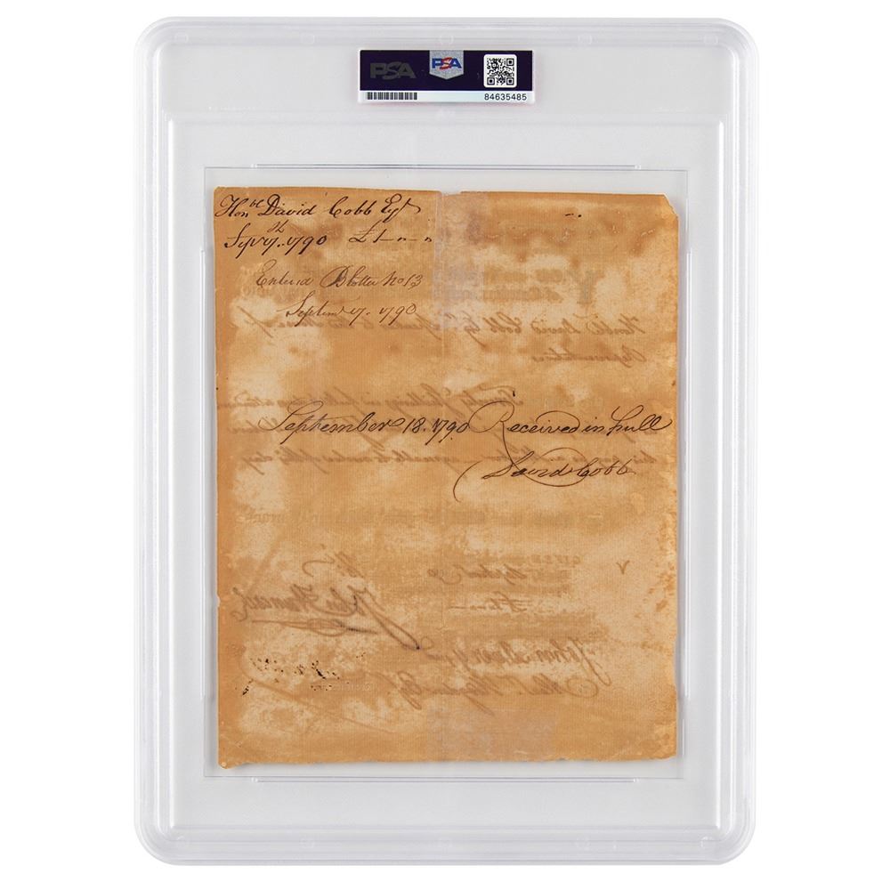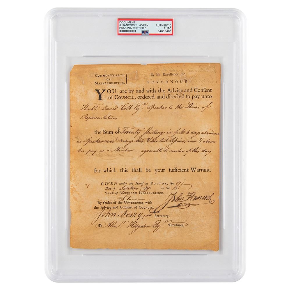Partly-printed DS, one page, 7.25 x 9, September 17, 1790. As governor of Massachusetts, Hancock directs Treasurer Alexander Hodgdon “to pay unto Honble David Cobb Esq’r Speaker to the House of Representatives the Sum of Twenty Shillings in full 4 days attendance as Speaker…3 days this & one last Session, over & above his pay as a Member—agreeable to resolve of this day for which this shall be your sufficient Warrant." Signed prominently at the conclusion by John Hancock and countersigned by Secretary John Avery and by Treasurer Hodgdon. Signed on the reverse by Cobb (1748–1830), who served as the Speaker of the Massachusetts House of Representatives from May 1789 until January 1793. In very good to fine condition, with irregular overall toning, and two archival repairs on the reverse. Encapsulated in a PSA/DNA authentication holder. Prior to his holding of several high-ranking posts within the Commonwealth, including President of the Massachusetts Senate and the state's Lieutenant Governor, Cobb served as aide-de-camp to George Washington during the Revolutionary War. He was appointed Major General of Militia in 1786 and rendered conspicuous service during Shays' Rebellion. An exceptional document rife with noteworthy political Bay State figures.