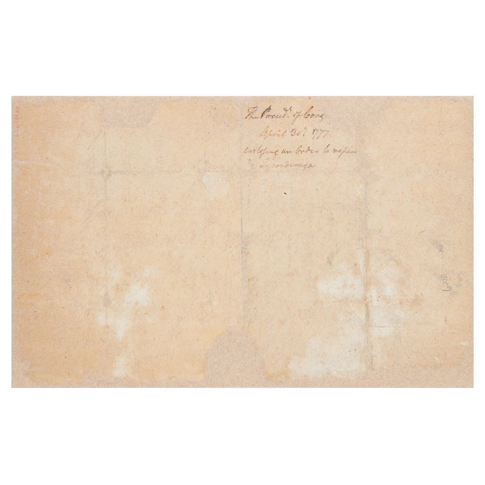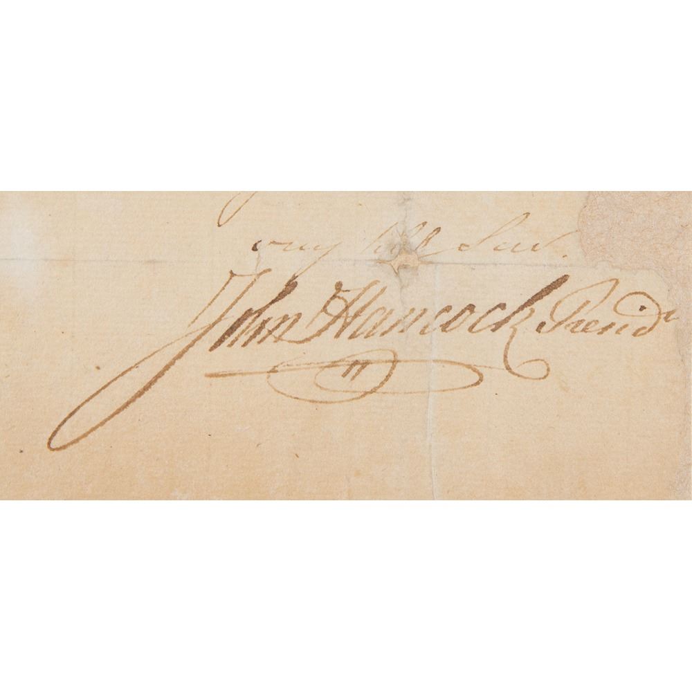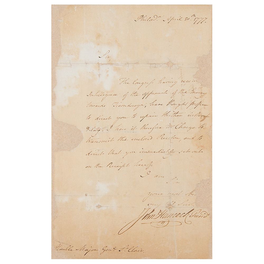 Revolutionary War–dated LS signed “John Hancock Presid't,” one page, 8 x 12.75, April 30, 1777. Significant letter by Hancock as president of Continental Congress, addressed to Major General Arthur St. Clair, ordering him to take charge at Ticonderoga in light of "the approach of the enemy." In full: "The Congress having received Intelligence of the approach of the Enemy towards Ticonderoga, have thought proper to direct you to repair thither without delay. I have it therefore in Charge to transmit the enclosed Resolve, and direct that you immediately set out on the receipt hereof." In very good condition, with irregular toning, complete backing, and professional restoration to areas of paper loss.