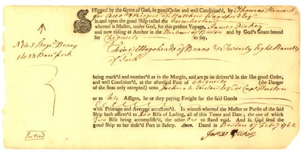 John Hancock, partly-printed document, filled out by Hancock, with his last name incorporated into the text of the document "Hancock". This one page document, approximately 9x4.5 inches, dated "Boston Febr. 7, 1762" in the full hand of Hancock in place of his Uncle Thomas (July 17, 1703 – August 1, 1764) a merchant in colonial Boston. A bill of lading for a ship in Boston Harbor. In part: “Shipped by the Grace of God, in good Order and well Condition’d, by Thomas Hancock (the uncle of John Hancock)... in and upon the good Ship called Cumberland whereof is Mafter, under God, for this prefent Voyage, James Dickey and now riding at Anchor in the "Harbour of Boston" and by God’s Grace bound for "Chignecto" to fay, "Five Hogsheads of Beans & Twenty Eight Barrells of Pork.” This document is in fine condition, with scattered mild toning. A wonderful opportunity to own the original hand writing, including the incorporated surname of "Hancock", from the man himself