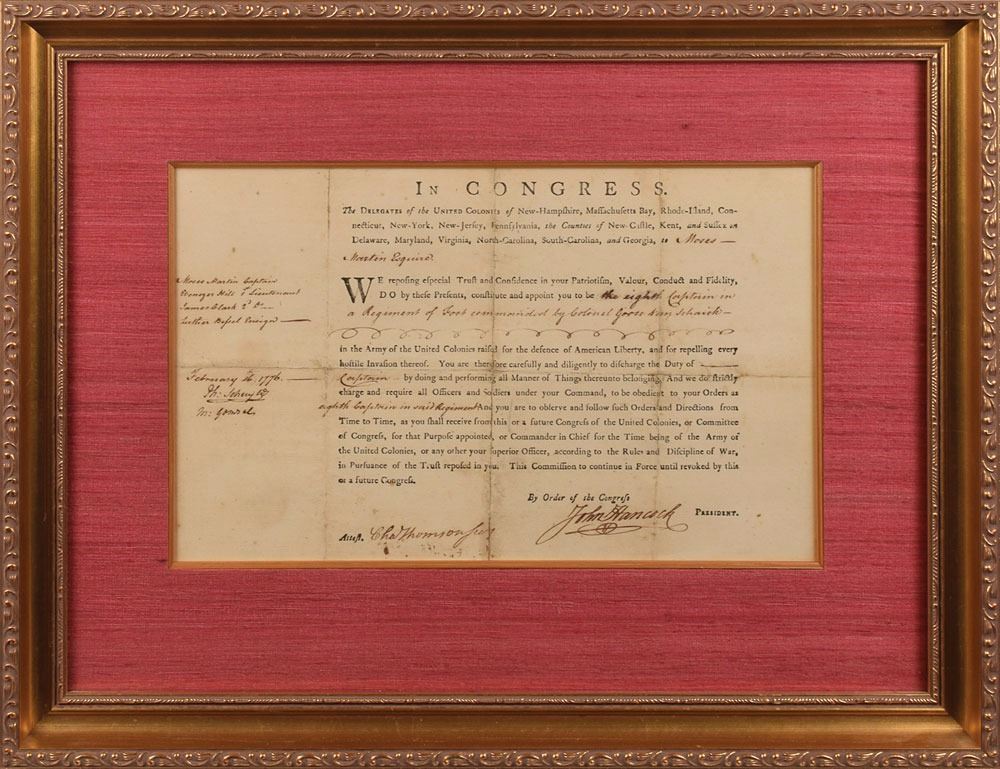 Revolutionary War–dated partly-printed DS, one page, 15 x 9, February 16, 1776. As president of the Continental Congress, Hancock appoints Moses Martin "to be the eighth Captain in a Regiment of Foot commanded by Colonel Goose Van Schaick, in the Army of the United Colonies raised for the defence of American Liberty, and for repelling every hostile Invasion thereof." Boldly signed at the conclusion by Hancock and countersigned by Charles Thomson as secretary. Handsomely cloth-matted and framed to an overall size of 23.5 x 18. In very good to fine condition, with repaired separations to intersecting folds.