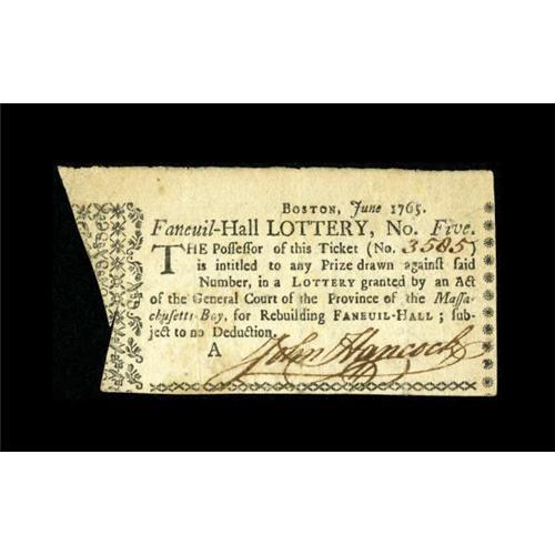 <B>John Hancock Signed Lottery Ticket.</B></I> This piece graced the CAA 1996 Rosemont Auction where it was described, "A June 1765 lottery ticket for the rebuilding of Faneuil Hall. It is boldly signed by John Hancock, whose distinctive signature on the Declaration of Independence gave rise to the nickname by which all signatures are still known. The lottery ticket itself shows a large portion of its indent and an extra broad top margin, apparently from the top of the sheet."<BR><BR><b>Shipping:</b> Coins & Currency (<a target="_blank" href="http://www.heritageauctions.com/common/shipping.php">view shipping information</a>)