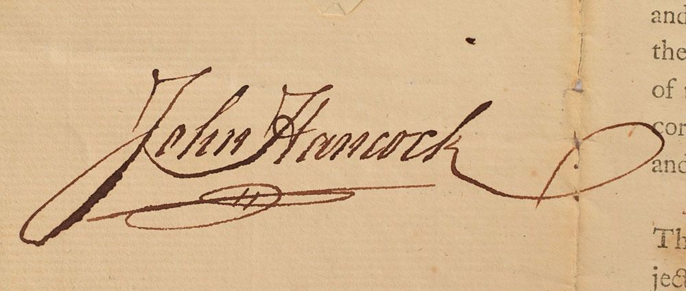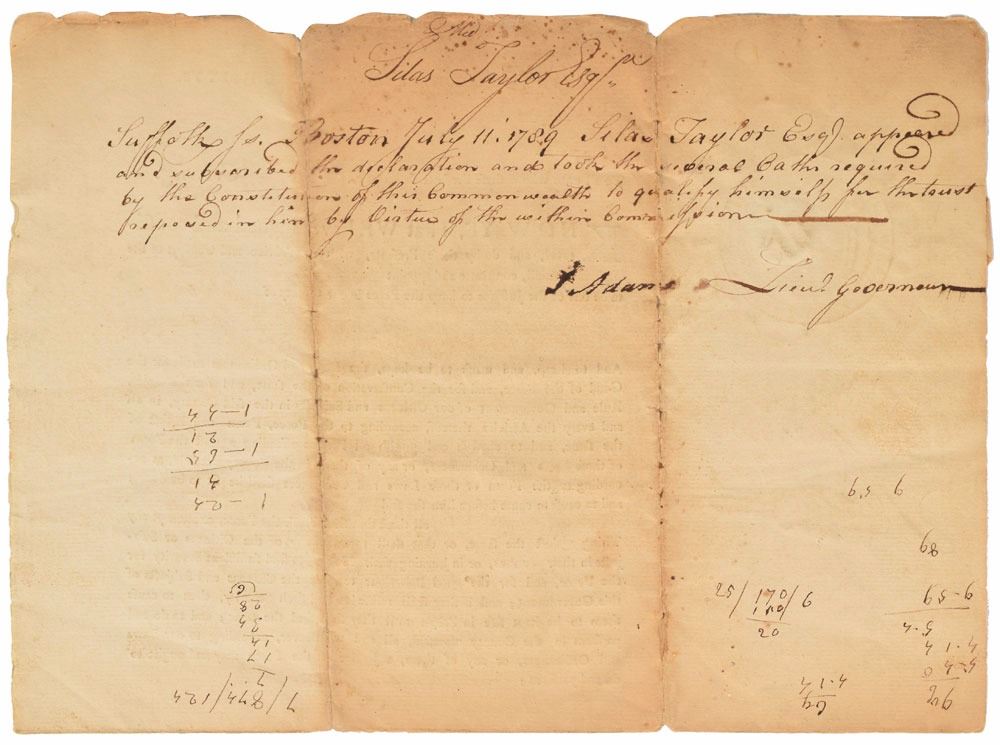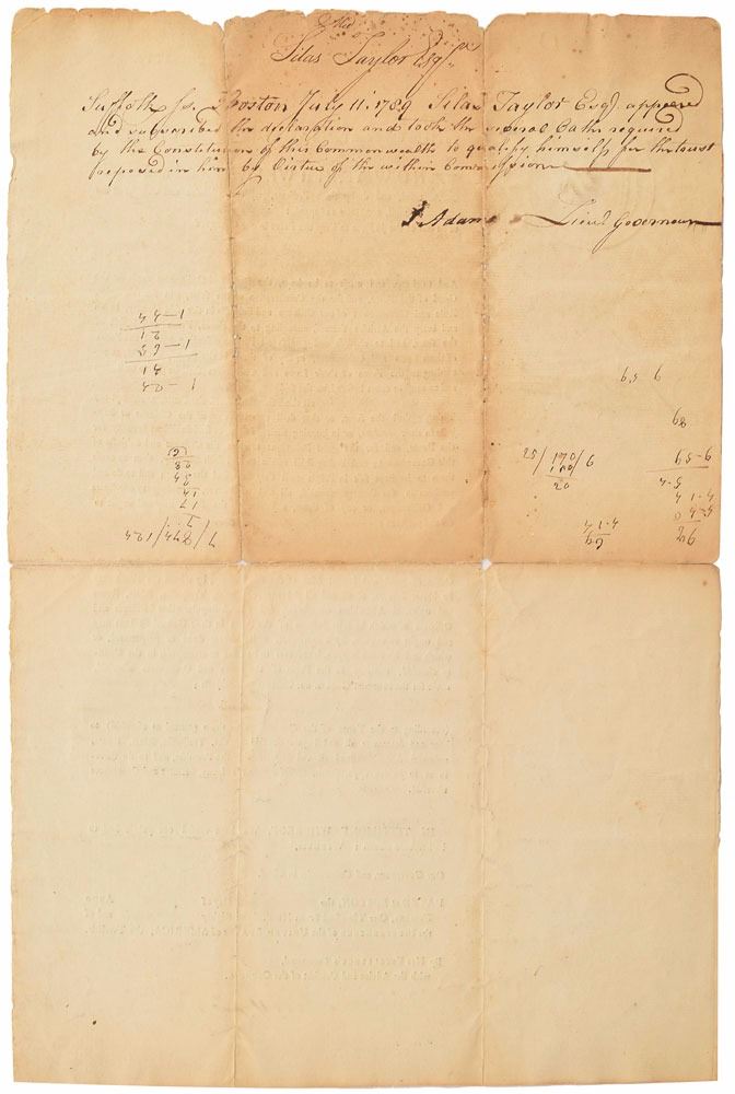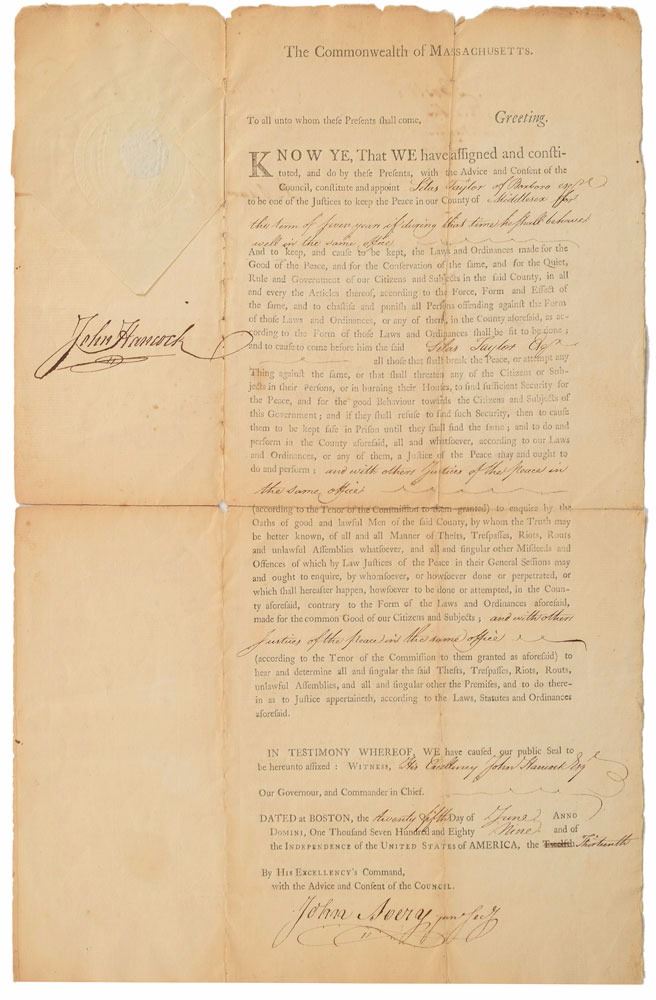 Partly-printed DS, signed “John Hancock” and "S. Adams," one page, 11.5 x 17, June 25, 1789. As governor of Massachusetts, Hancock appoints "Silas Taylor of Boxboro esq're to be one of the Justices to keep the Peace in our County of Middlesex for the term of seven years, if during that time he shall behave well in that office." Boldly signed on the left side below the affixed seal by Hancock, and countersigned at the conclusion by John Avery as junior secretary. Endorsed on the reverse by Adams as lieutenant governor, beneath a manuscript statement dated July 11, 1789, certifying that Taylor "took the several Oaths required by the Constitution of this Commonwealth to qualify himself." In very good to fine condition, with light toning and small areas of paper loss along intersecting folds, and complete separation to the central horizontal fold which could easily be repaired. The white wafer seal is fully intact, and Hancock’s signature bold and prominent. Adams would succeed Hancock as governor upon his death in 1793, and went on to be elected for four consecutive annual terms. An exceptionally desirable combination of two foremost leaders of the American Revolution, this is just the fourth Hancock-Adams document we have offered.