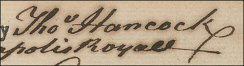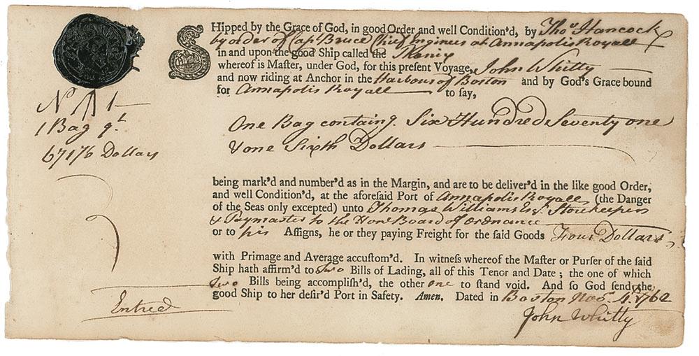 Partly printed unsigned DS filled out in Hancock’s hand (and including his surname “Hancock”), one page, 9 x 4.5, November 4, 1762. A bill of lading. In part: “Shipped by the Grace of God, in good Order and well Condition’d, by Tho’ Hancock by order of Captain Bruce Chief Engineer…in and upon the good Ship called the Thanix whereof is Master, under God, for this present Voyage, John Whitty and now riding at Anchor in the Harbour of Boston and by God’s Grace bound for Annapolis Royall to say, One bag containing Six Hundred Seventy One & one sixth Dollars.” Light toning and soiling, light creasing and wrinkling, and a rough left edge, otherwise fine condition.