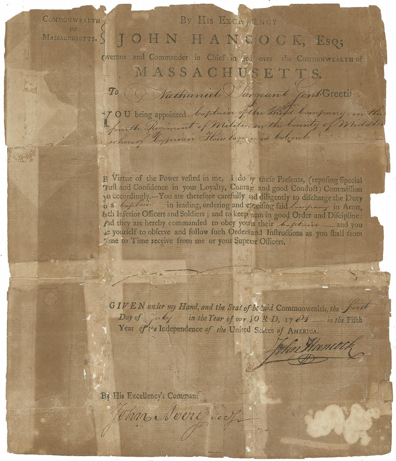 Partly-printed DS, one page, 10 x 12, July 1, 1781. Military appointment reads, in full: “To Nathaniel Sargeant Gent. Greeting. You being appointed Captain of the Third Company, in the fourth Regiment of Militia in the County of Middles[ex] whereof Cyprian How Esqr is Colonel. By Virtue of the Power vested in me, I do by these Presents, (reposing Special Trust and Confidence in your Loyalty, Courage and good Conduct) Commission you accordingly,—You are therefore carefully and diligently to discharge the Duty of a Captain in leading, ordering and exercising said Company in Arms, both Inferior Officers and Soldiers; and to keep them in good Order and Discipline: And they are hereby commanded to obey you as their Captain and you are yourself to observe and follow such Orders and Instructions as you shall from Time to Time receive from me or your Superior Officers.” The item has been archivally sleeved in acid free Mylar. In fair condition, with heavy overall toning, repairs to multiple separations along intersecting folds on reverse, areas of discoloration to the front from old repairs affecting appearance, scattered edge chipping, scattered small areas of paper loss, a few letters of the document missing due to repairs (not affecting legibility), and a small repair affecting the first letter of Hancock’s signature. Only a small center portion of seal remains intact.