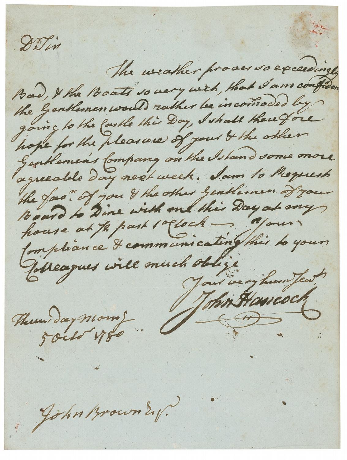 Boldly penned Revolutionary War-dated ALS, one page, 6.75 x 9, October 5, 1780. Letter to John Brown Esq. In full: “The weather proves so exceedingly bad, & the boats so very cold that I am confident the Gentlemen would rather be incommoded by going to the castle this Day, I shall therefore hope for the pleasure of your & the other Gentlemen's company on the Island some more agreeable day next week. I am to request the favor of you & the other Gentlemen of your board to dine with me this Day at my house at half past 1 o'clock—Your compliance & communicating this to your colleagues will much oblige.” Intersecting mailing folds (one through a single letter of signature), scattered mild toning (mostly to edges), some stray ink flecks, and mild show-through from red wax seal on reverse, otherwise fine condition.