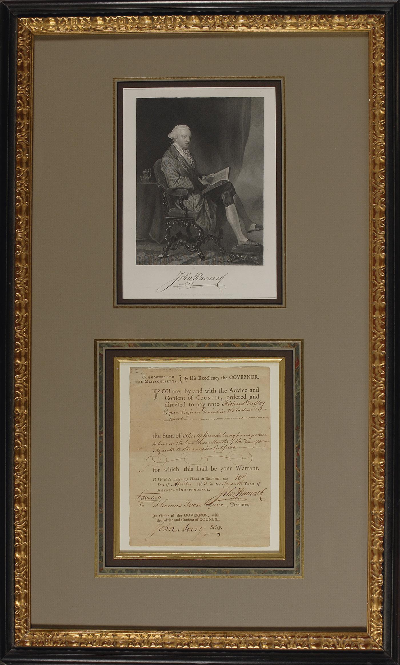 Partly-printed DS, one page, 6 x 7.75, April 16, 1783. Governor Hancock issues a pay order to “Richard Gridley Esquire Engineer general in the Eastern Department the sum of Thirty pounds being for wages due to him in the last three months of the Year 1780.” Beautifully signed at the conclusion by Hancock, and countersigned by secretary John Avery. Triple matted and framed, so the docketing on reverse may be viewed as well, along with an engraved portrait, to an overall size of 18 x 29.5 In very good condition, with intersecting folds, mild overall toning, with a heavier block to upper left, and a small tear to top edge.