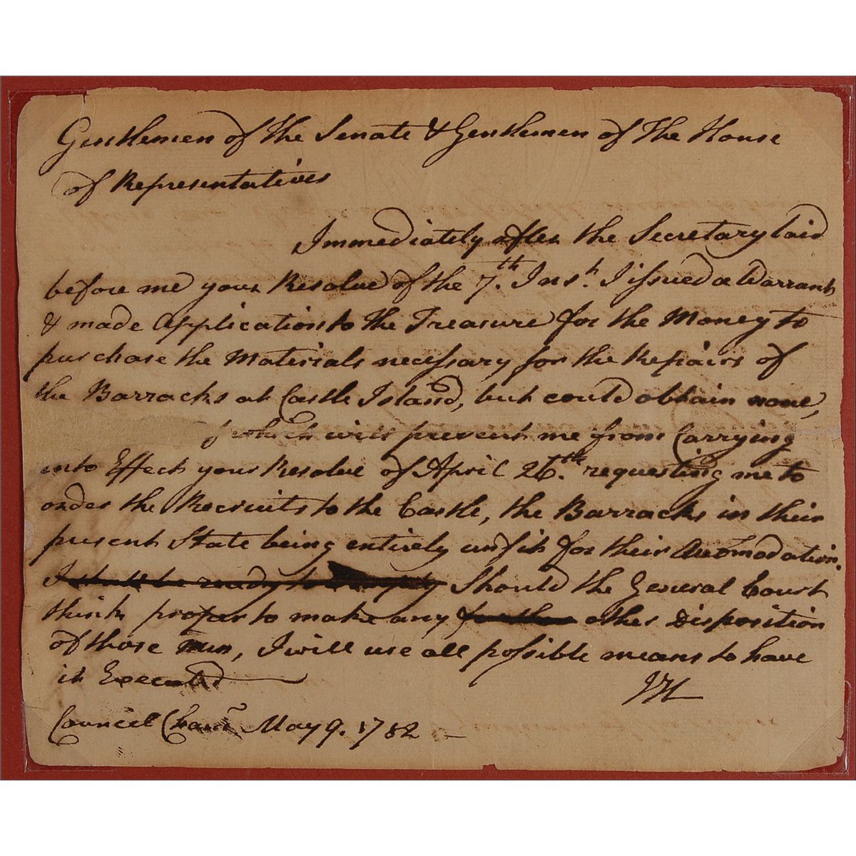 ALS (a retained copy), signed “JH,” one page, 7.25 x 6, May 9, 1782. Hancock, as Governor of Massachusetts, writes to the Massachusetts General Court regarding the difficulty in obtaining funds to improve the barracks at Castle Island. In full: “Immediately after the Secretary laid before me your Resolve of the 7th Inst. I issued a Warrant & made Applications to the Treasurer for the Money to purchase the Materials necessary for the Repairs of the Barracks at Castle Island, but could obtain none […] of which will prevent me from Carrying into Effect your Resolve of April 26th requesting me to order the Recruits to the Castle, the Barracks in their present State being entirely unfit for their Accommodation. Should the General Court think proper to make any other Disposition of those men, I will use all possible means to have it Executed.” Removably mounted by its corner tips and matted and framed with a previous description and two portraits of Hancock to an overall size of 22 x 18. Complete horizontal separation and related paper loss (professionally repaired) affecting a few words, partial separation to a crossed-out line of text, toning, and light edge wear, none of the above affecting the signature, otherwise very good condition. Formerly part of the Hancock-Chase collection at the National Museum of American History.