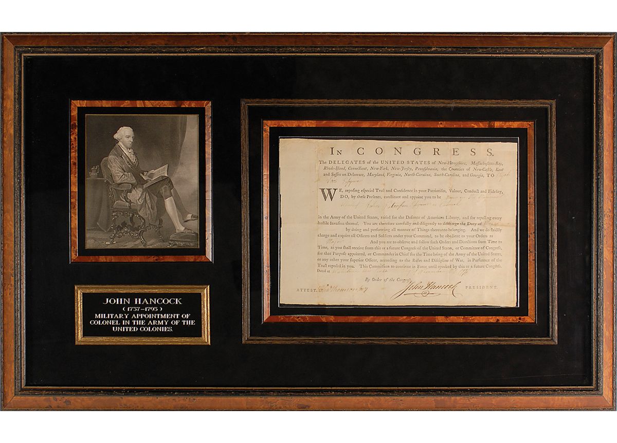 Partly-printed Revolutionary War-dated DS, one page, 11.5 x 8, November 6, 1776. Hancock, as President of Congress, appoints a Major to a regiment. Appointment reads, in part: “The DELEGATES of the UNITED COLONIES of New-Hampshire, Massachusetts-Bay, Rhode-Island, Connecticut, New-York, New-Jersey, Pennsylvania, the Counties of New-Castle, Kent, and Sussex on Delaware, Maryland, Virginia, North-Carolina, South-Carolina, and Georgia, to Elijah Vors, Esquire. WE reposing especial Trust and Confidence in your Patriotism, Valour, Conduct and Fidelity, DO, by these presents, constitute and appoint you to be Major in the Regiment Whereof John Peterson Esquire is Colonel, in the Army of the United States, raised for the defense of American Liberty, and for repelling every hostile Invasion thereof. You are therefore carefully and diligently to discharge the Duty of Second Lieutenant by doing and performing all Manner of Things thereunto belonging.” Attractively double suede matted and framed, with a portrait of Hancock and an informational plaque, to an overall size of 31 x 19. In very good condition, with intersecting folds, a couple passing through signature, several repaired separations, scattered toning, handwritten portions a shade light, and a few other small repairs.