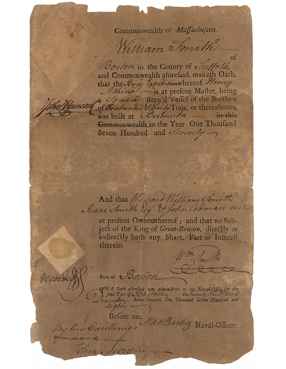 Partly-printed DS, one page, 8 x 12.75, December 23, 1780. Document regarding ownership of a sea vessel. In part; “William Smith of Boston…maketh oath that the Brig Expedition whereof Henry Atkins is at present Master being a square-sterned Vessel…was built at Bermuda in the year One Thousand Seven Hundred and Seventy and that the said William Smith, Isaac Smith Esq & John Codman are at present Owners thereof; and that no subject of the King of Great Britain, directly or indirectly hath any Share, part, of Interest therein.” In good condition, with partial separations along central horizontal and vertical folds, repaired separation to reverse of vertical fold, moderate to heavy overall toning, and scattered paper loss to edges. Hancock’s signature remains quite bold and visually appealing.