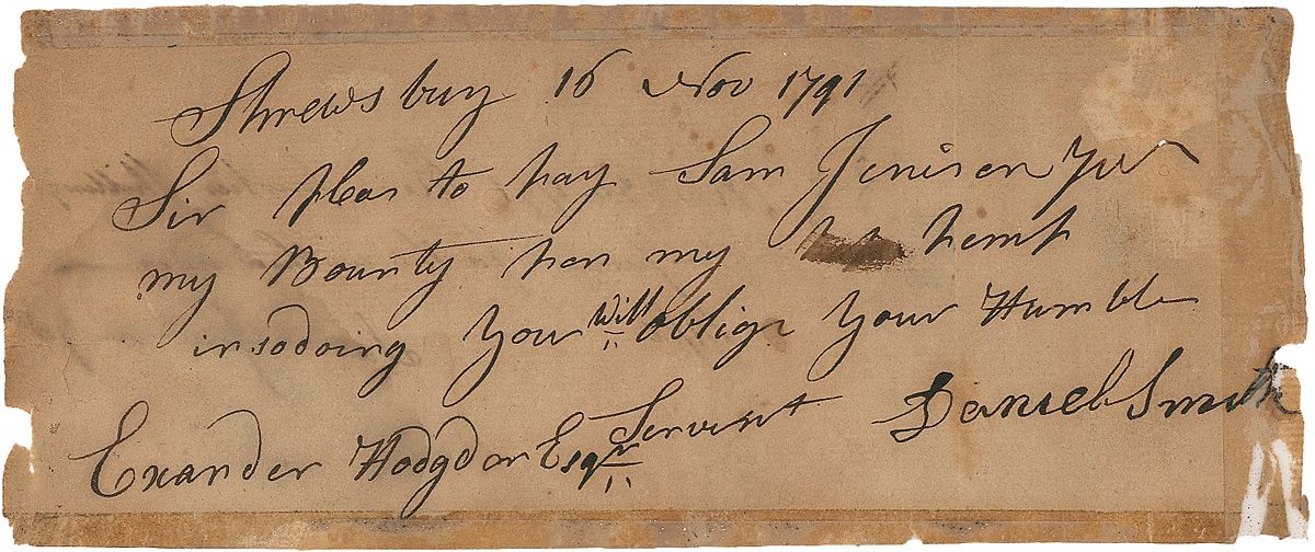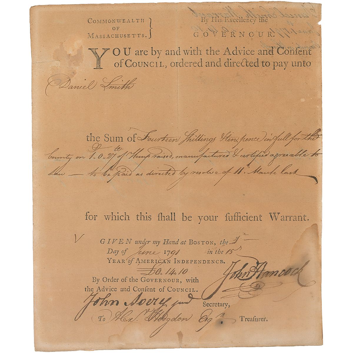 Partly-printed DS, one page, 7 x 8.5, June 1, 1791. Document issued to Alexander Hodgdon. In full: “You are by and with the Advice and Consent of Council, ordered and directed to pay unto Daniel Smith the Sum of Fourteen Shillings & ten pence in full for the bounty on 1.0.27 of Hemp raised, manufactured & certified agreeable to Law–to be paid as directed by resolve of 11th March last for which this shall be your sufficient Warrant.” Signed at the conclusion by Hancock and countersigned by John Avery. Accompanied by a manuscript DS, signed “Daniel Smith,” one page, 7.5 x 3.25, authorizing the treasurer “to Pay Sam Jenison Jnr my Bounty…” Numerous flaws. Endorsement on verso “Novr 30. 1791. Recd fourteen Shillings & ten pence–for the within order. 14/10” signed “Sam Jenison Jr.” A central vertical fold, moderate uniform toning, thin area of paper to top left where seal has been removed, dampstaining over last name of Hancock’s signature, not affecting legibility, and mild rippling, otherwise very good condition.