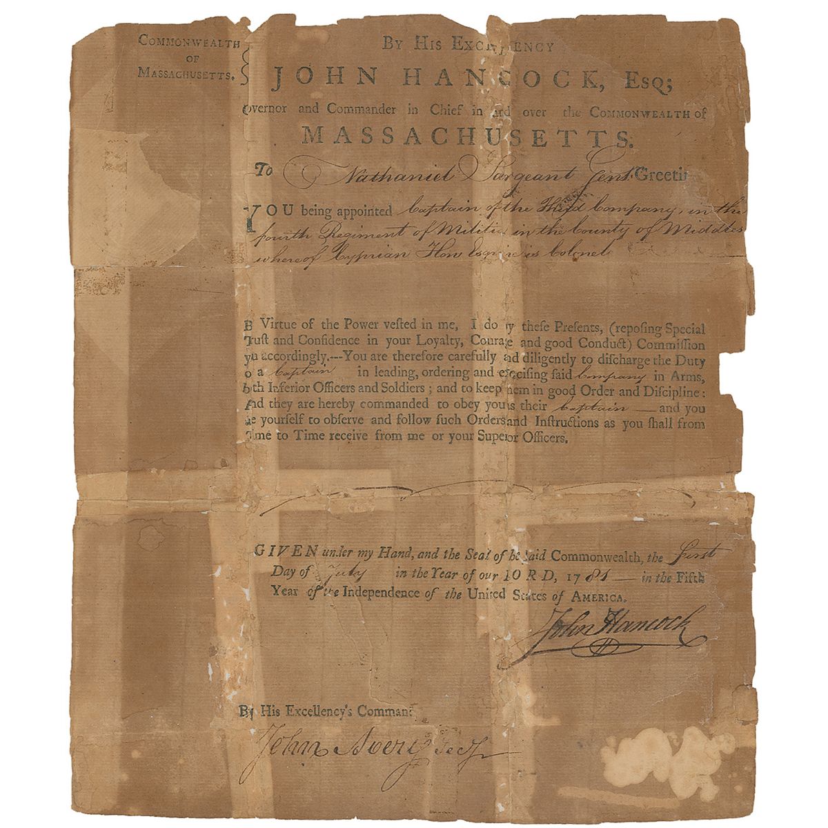 Revolutionary War-dated partly-printed DS, one page, 10 x 12, July 1, 1781. Military appointment reads, in full: “To Nathaniel Sargeant Gent. Greeting. You being appointed Captain of the Third Company, in the fourth Regiment of Militia in the County of Middles[ex] whereof Cyprian How Esqr is Colonel. By Virtue of the Power vested in me, I do by these Presents, (reposing Special Trust and Confidence in your Loyalty, Courage and good Conduct) Commission you accordingly,—You are therefore carefully and diligently to discharge the Duty of a Captain in leading, ordering and exercising said Company in Arms, both Inferior Officers and Soldiers; and to keep them in good Order and Discipline: And they are hereby commanded to obey you as their Captain and you are yourself to observe and follow such Orders and Instructions as you shall from Time to Time receive from me or your Superior Officers.” The item has been archivally sleeved in acid-free Mylar. In fair condition, with heavy overall toning, repairs to multiple separations along intersecting folds on reverse, areas of discoloration to the front from old repairs affecting appearance, scattered edge chipping, scattered small areas of paper loss, a few letters of the document missing due to repairs (not affecting legibility), and a small repair affecting the first letter of Hancock’s signature. Only a small center portion of seal remains intact.