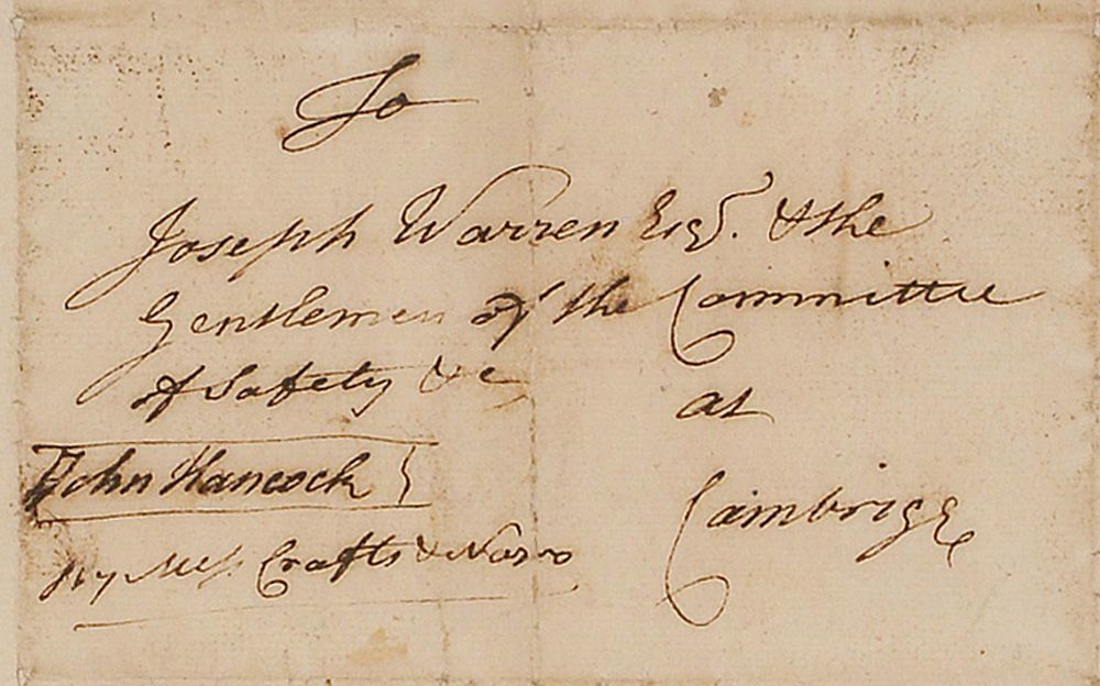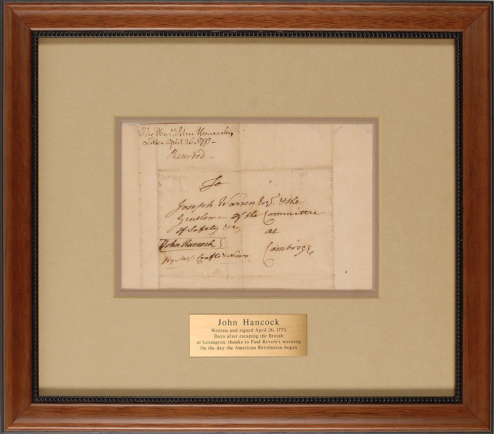 Revolutionary War-dated hand-addressed full free frank, measuring 7.5 x 5, with the address panel measuring 5.25 x 3.25, addressed by Hancock to “To Joseph Warren Esq. & the Gentlemen of the Committee of Safety & C. at Cambridge.” Franked on the left side of the address panel, “John Hancock.” Frank is also docketed in the top left, presumably by Warren’s secretary, “The Honl. John Hancock, Letter April 26, 1775.” Nicely double-matted and framed to an overall size of 14.75 x 13. In very good condition, with central vertical fold to address panel, expected folds to outer portions, and scattered light toning and soiling, some light paper loss to edges and along folds, and some scattered pinholes of paper loss. Accompanied by a full letter of authenticity from PSA/DNA. The letter that this envelope originally enclosed discussed military matters and referred to Samuel Adams, General Heath, Edward Crafts, and Nathaniel Nazro, whose last names (Crafts & Nazro) were written by Hancock below his franking signature on the here-offered piece. It was Warren that sent Paul Revere and William Dawes on their legendary ‘midnight rides’ to warn Hancock and Samuel Adams. An incredibly rare war-dated item between Hancock and Warren, who would be killed later at Bunker Hill.