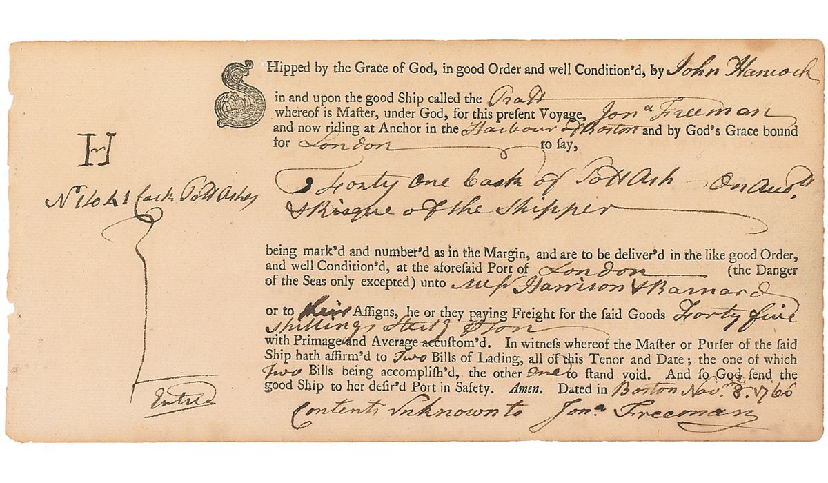 Partly-printed DS, filled out in Hancock’s hand and signed in the body “John Hancock,” one page, 9 x 4.5, November 8, 1766. A bill of lading for a brig in Boston Harbor. In part: “Shipped by the Grace of God, in good Order and well Condition’d, by John Hancock, and in and upon the good Brig called the Draft whereof is Master, under God, for this present Voyage, Jona Freeman and now riding at Anchor in the Harbour of Boston and by God’s Grace bound for London to say, Forty one casks of Pott Ash…& Risque of the Skipper being mark’d and number’d as in the Margin, and are to be deliver’d in the like good Order.” In very good to fine condition, with scattered light toning and soiling, rough left edge, and some mild rippling.