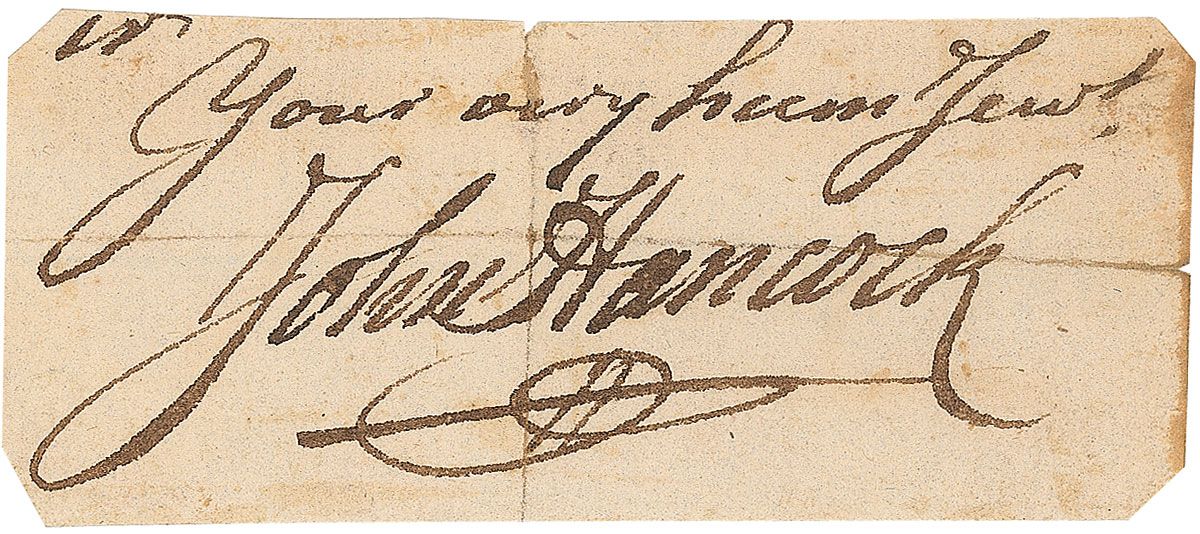 Bold ink signature and sentiment, “Your very hum Sevt, John Hancock,” on an off-white 3.25 x 1.5 slip clipped from a larger letter and affixed to a 7.5 x 3.5 off-white sheet. In very good condition, with central horizontal and vertical fold, both lightly passing through signature, clipped corner tips, and scattered toning. The faults do not detract from the overall appearance of this particularly large signature.