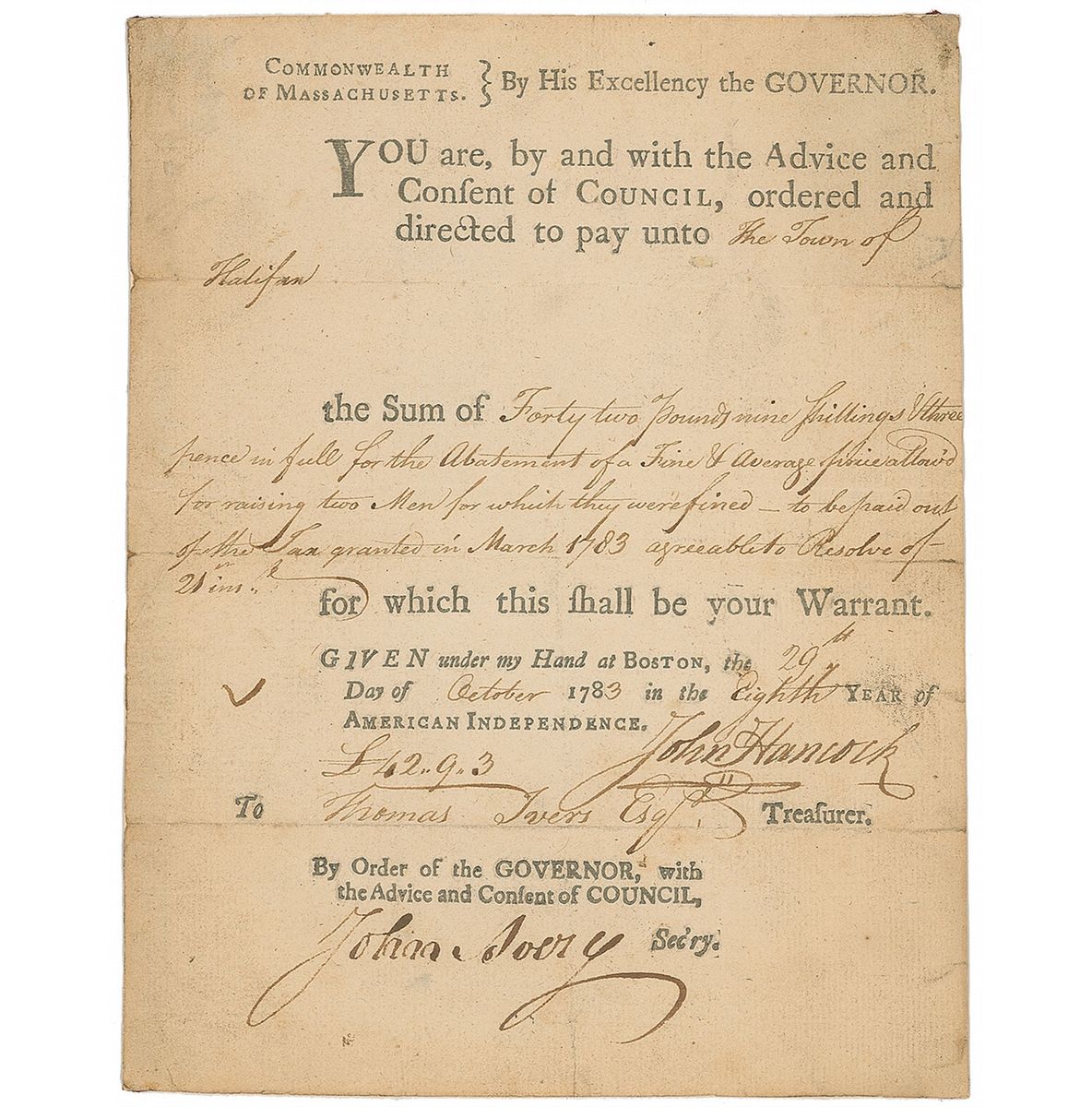 Partly-printed DS one page, 6.5 x 8, October 29, 1783. Hancock issues a pay order to the town of Halifax for “Forty two pounds nine shillings & three pence in full for the Abatement of a Fine…allowed for raising two Men for which they were fined.” Signed at the conclusion by Hancock and countersigned by Treasurer Thomas Ivers as well as Secretary John Avery. Document is affixed to an identical size sheet. Possibly slightly trimmed and in very good condition, with intersecting folds, and scattered light toning and soiling.
