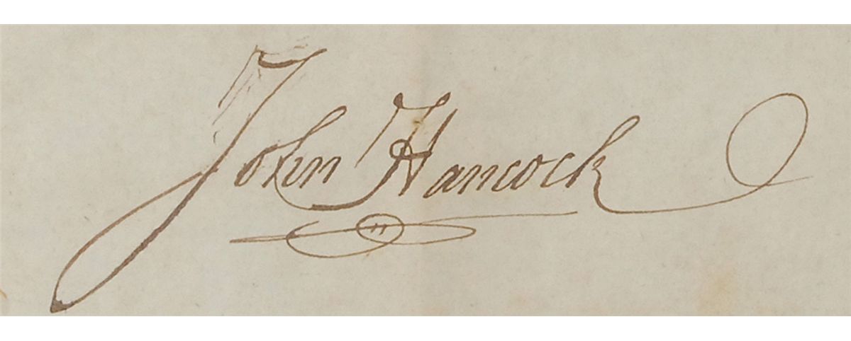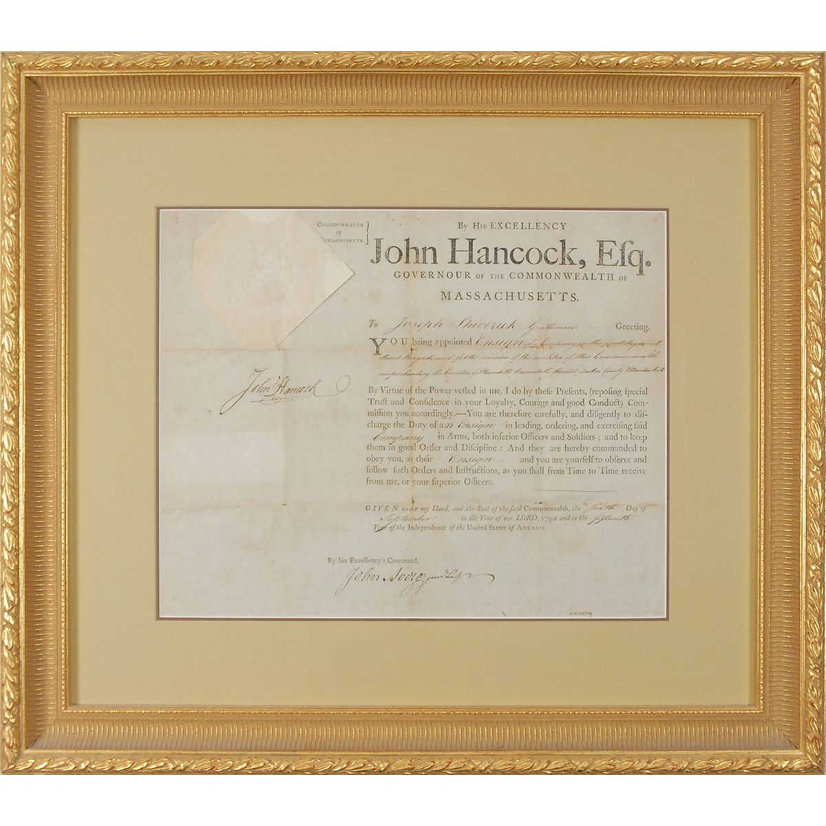Choice partly-printed DS one page, 15 x 12, September 10, 1790. Hancock appoints Joseph Shiverick as “Ensign of a Company in the first Regiment third Brigade and fifth Division of the militia of this Commonwealth comprehending the Counties of Plimouth, Barnstable, Bristol, Dukes County & Nantucket.” Attractively signed on the left side by Hancock as governor of Massachusetts and countersigned at the conclusion by John Avery. Nicely double-matted and framed to an overall size of 24 x 21.5. Paper seal affixed above Hancock’s signature remains quite crisp and fully intact. In fine condition, with intersecting folds (one vertical fold passing through first letter of his last name), mild toning, and a few tiny holes. An especially clean and appealing Hancock document. Oversized.