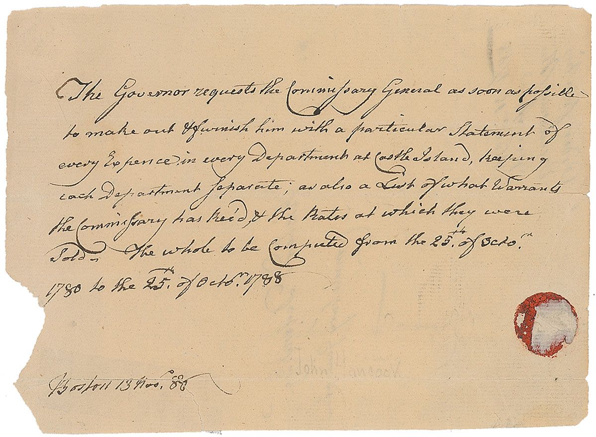 Third-person ALS, one page, 7.5 x 5.25, November 13, 1788. Letter to Commissary General Richard Devens, in full: “The Governor requests the Commissary General as soon as possible to make out & furnish him with a particular statement of every expence in every Department at Castle Island, keeping each Department separate; and also a List of what Warrants the Commissary has Rec'd, & the Rates at which they were Sold. The whole to be computed from the 25th of Octo. 1780 to the 25th of Octo. 1788.” A couple of small separations along intersecting folds, tape repairs to bottom corners, with one through the date, and paper loss to left edge, not affecting any of the text, otherwise fine condition.