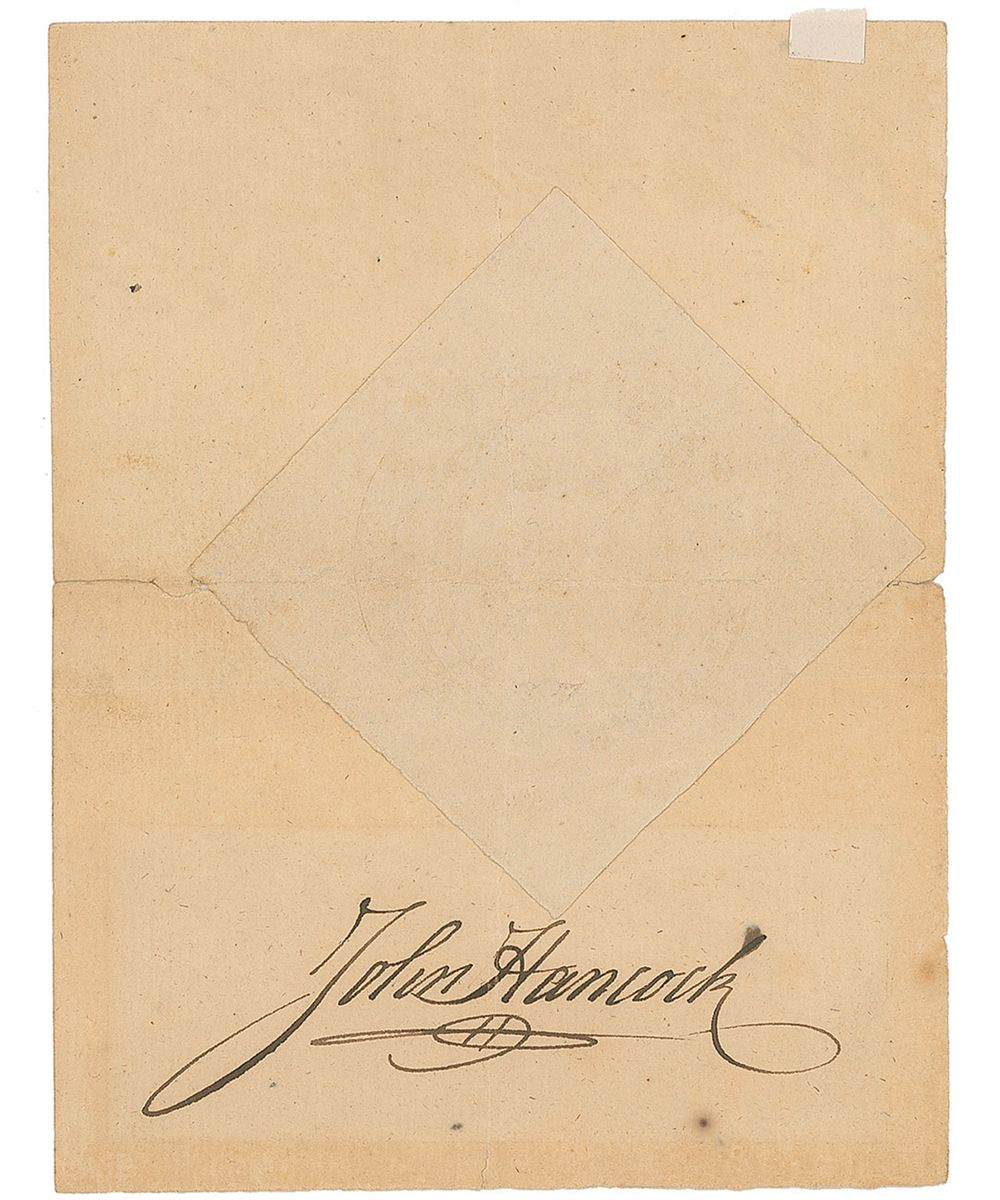 Choice ink signature, “John Hancock,” on an off-white 4.5 x 6 slip clipped from a larger State of Massachusetts document, retaining the affixed paper seal above the signature. Intersecting folds and mild overall toning from previous display, otherwise fine condition. A terrific example of America’s most famous signature.