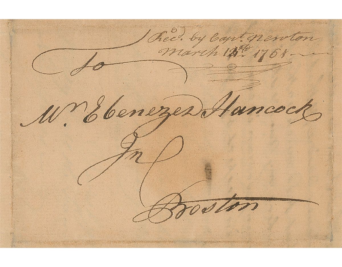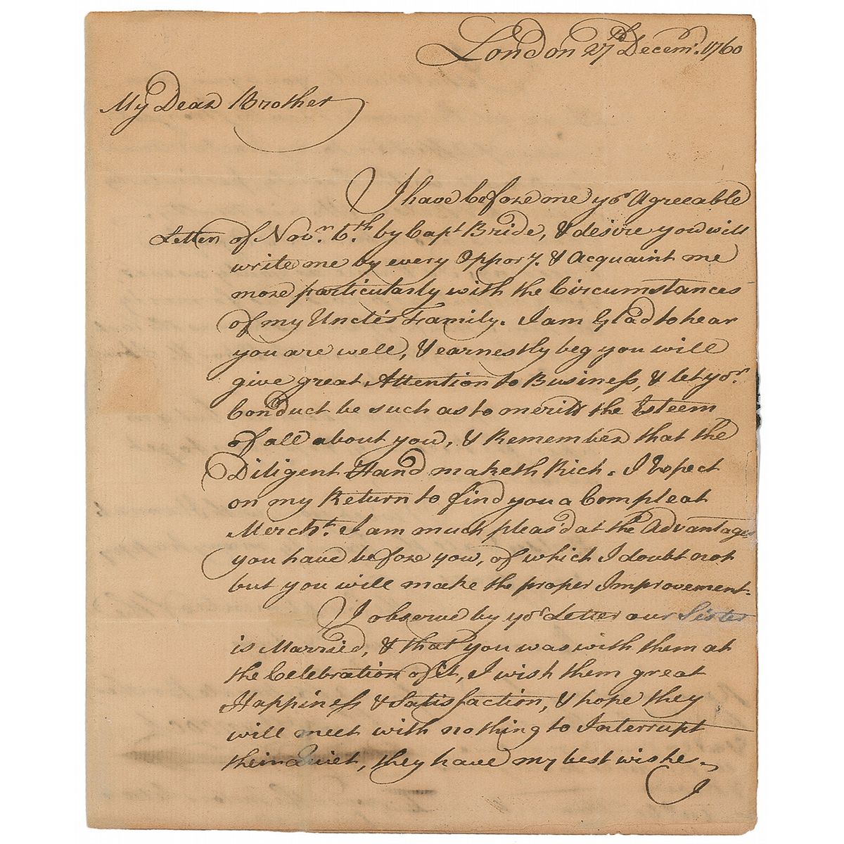 Exquisite ALS signed “Jno. Hancock,” three pages on two adjoining sheets, 7 x 8.75, December 27, 1760. Letter to his brother, Ebenezer Hancock. In part: “I have before me yo'r agreeable Letters of Nov'r 6th by Capt Bride, & desire you will write one by every oppry [opportunity] & acquaint me more particularly with the Circumstances of my Uncle’s Family. I am glad to hear you are well, & earnestly beg you will give great Attention to Business, & let yo'r Conduct be such as to merit the Esteem of all about you, & Remember that the Diligent Hand maketh Rich. I hope at on my Return to find you a Compleat Merch't I am much please'd at the Advantages you have before you, of which I doubt not but you will make the proper Improvement.