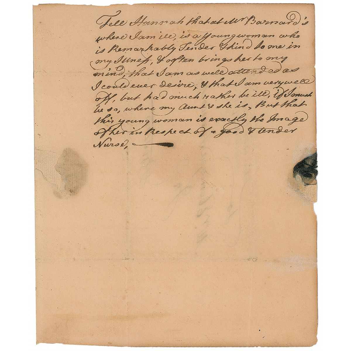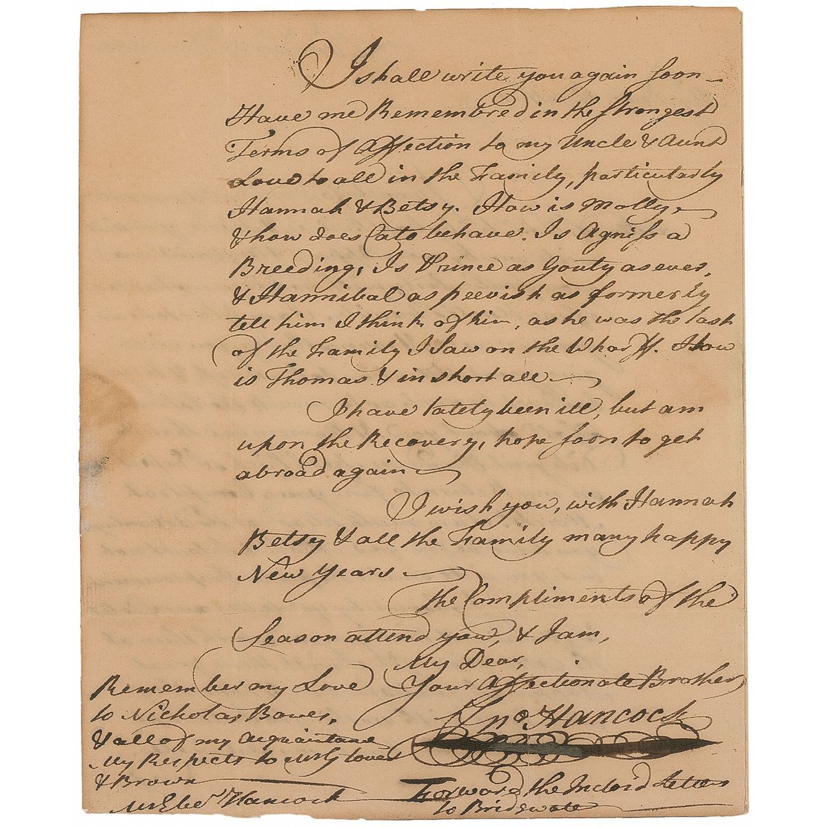 I observe by yo'r Letter our Sister is Married, & that you was with them at the Celebration of it, I wish them great Happiness & Satisfaction, & I hope they will meet with nothing to Interrupt their Quiet, they have my best wishes, I shall write you again soon. Have me Remembered in the strongest Terms of Affection to my Uncle & Aunt Love to all in the Family, particularly Hannah & Betsy. How is Molly, & how does Cate behave. Is Agniss a Breeding, Is Prince as gouty as ever, & Hannibal as peevish as formerly tell him I think of him, as he was the last of the family I saw on the Wharf. How is Thomas & in short all. I have been lately ill, but am upon the Recovery, hope soon to get abroad again. I wish you, with Hannah Betsy & all the family many happy New Years." He adds another thought to the adjoining page, in full: "Tell Hannah that Mr Barnard’s where I am ill, is a young woman who is Remarkably Tender & kind to one in any Illness, & often brings her to my mind, that I am as well attended as I could ever desire, & that I am very well off, but had much rather be ill, if I must be so, where my Aunt & she is, But that this young woman is exactly the Image of her in Respect of a good and tender Nurse." Also addressed on the reverse by Hancock, "To Mr Ebenezer Hancock Jr., Boston." Intersecting folds with professional repairs to small edge separations, uniform toning, and slight chipping to edges, otherwise fine condition.