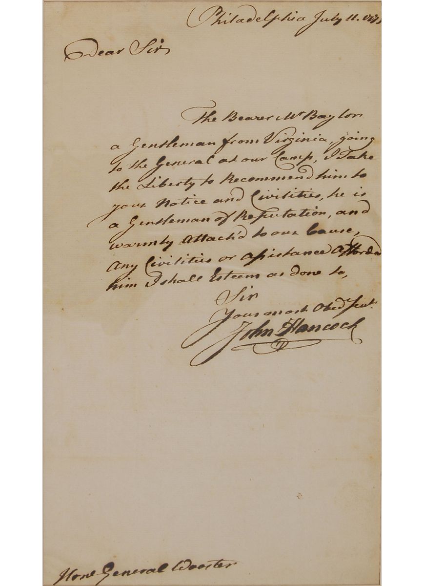 Outstanding Revolutionary War–dated ALS as president of the Continental Congress, one page, 7 x 12, Philadelphia, July 11, 1775. Letter to Major General David Wooster, recommending George Baylor for a military command. In full: “The Bearer Mr. Baylor a Gentleman from Virginia, going to the General at our Camp, I take the Liberty to Recommend him to your Notice and Civilities, he is a Gentleman of Reputation, and warmly attach’d to our Cause, any Civilities or Assistance afforded him I shall Esteem.” Matted to an overall size of 13.5 x 19. In fine condition, with trivial ink erosion to a few letters.