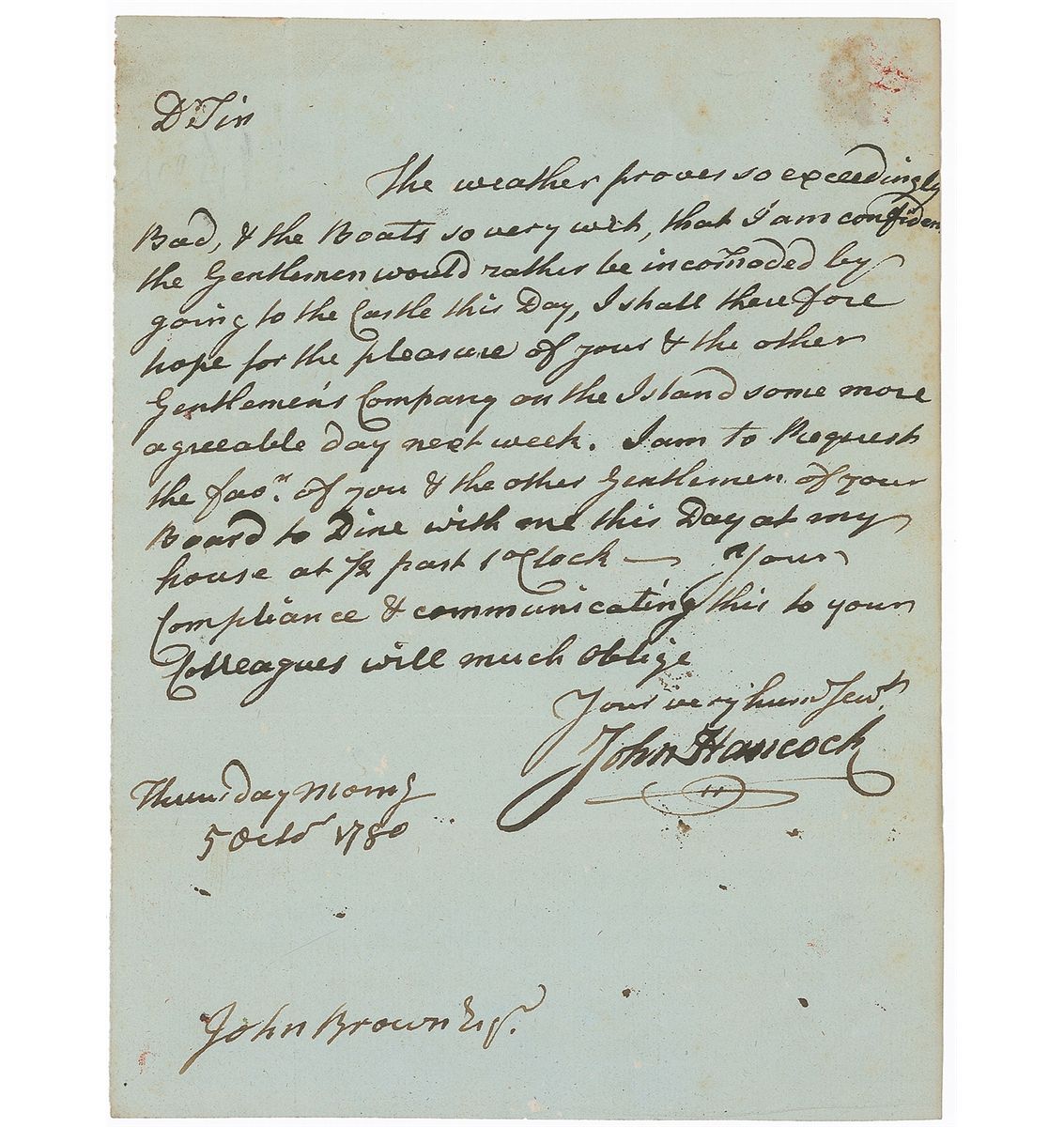 Boldly penned Revolutionary War-dated ALS, one page, 6.75 x 9, October 5, 1780. Letter to John Brown Esq. In full: “The weather proves so exceedingly bad, & the boats so very cold that I am confident the Gentlemen would rather be incommoded by going to the castle this Day, I shall therefore hope for the pleasure of your & the other Gentlemen's company on the Island some more agreeable day next week. I am to request the favor of you & the other Gentlemen of your board to dine with me this Day at my house at half past 1 o'clock—Your compliance & communicating this to your colleagues will much oblige.” Intersecting mailing folds (one through a single letter of signature), scattered mild toning (mostly to edges), some stray ink flecks, and mild show-through from red wax seal on reverse, otherwise fine condition. Hancock is more than likely referring to Castle Island, where Fort Castle William guarded Boston Harbor off South Boston. It is no surprise that he would forego a trip anywhere on the day in question as the 1780 Atlantic hurricane season was extraordinarily destructive. Three different hurricanes, all in October, each caused at least 1,000 deaths. Three weeks after writing this letter, the weather had cleared, and at the first meeting of the General Court on October 25, 1780, Hancock took his constitutional oath of office as the first governor of the Commonwealth of Massachusetts. Attractively and boldly penned, and highly presentable, this is as pristine a one-page, war-dated Hancock ALS as you could hope to find.