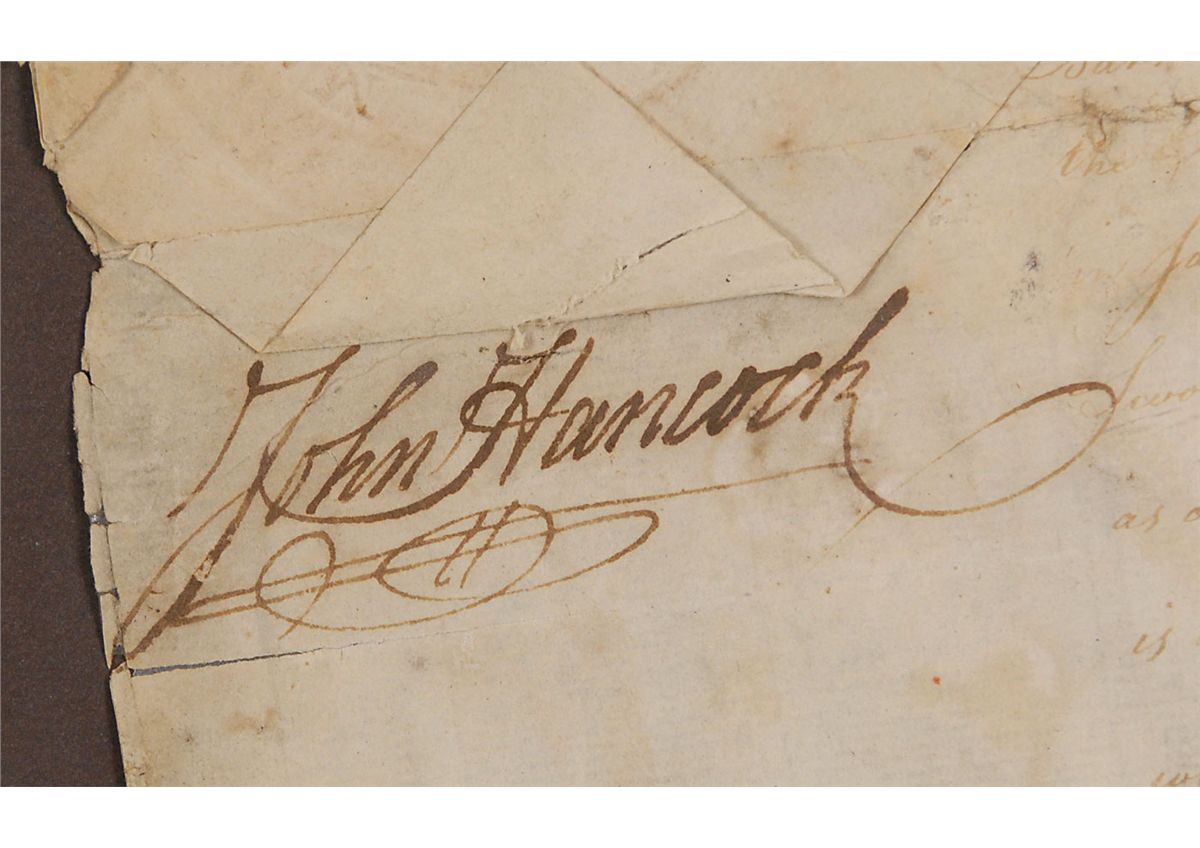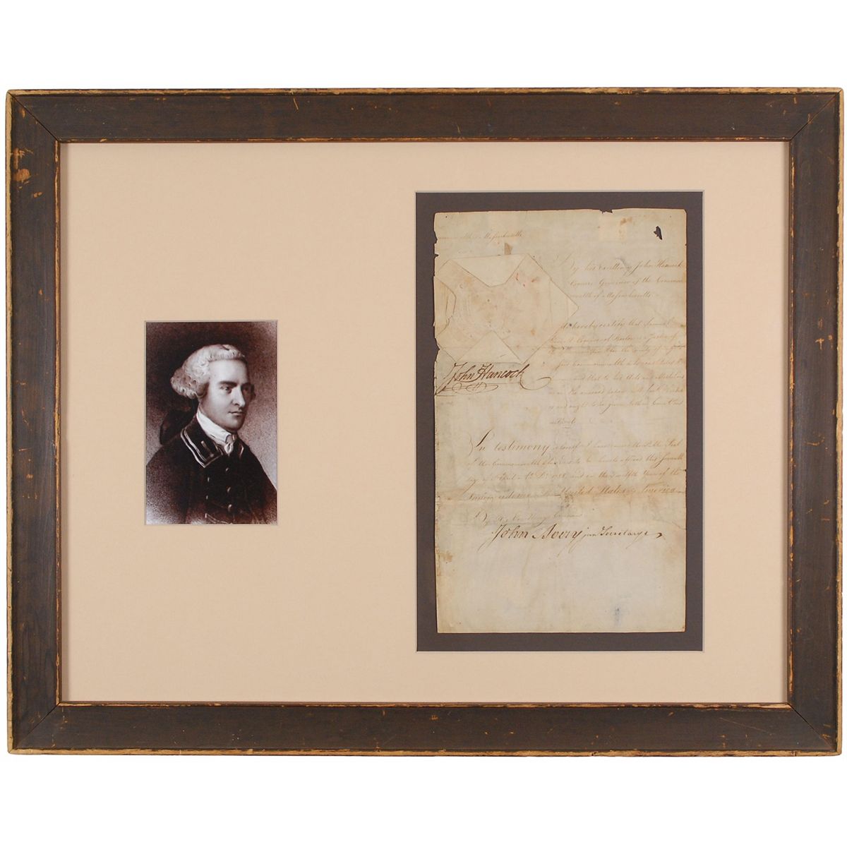 Manuscript DS, one page, 7 x 12, April 7, 1788. Hancock certifies “that Samuel Barrett Esquire of Boston is a Justice of the Peace.” Boldly signed In the left border by Hancock as governor of Massachusetts and countersigned by John Avery. Matted and framed with a photo of Hancock to an overall size of 23.5 x 18.75. Intersecting folds with slight separations, scattered toning and soiling, a few repaired tears to edges and body (not affecting the signature), otherwise very good condition; Hancock’s signature is an ideal, prominent example. The paper seal affixed above Hancock’s signature remains fully intact with a couple small tears. In this position, Barrett innovated debt collection by developing efficient partly-printed forms used to notify debtors of disputes and pending lawsuits.