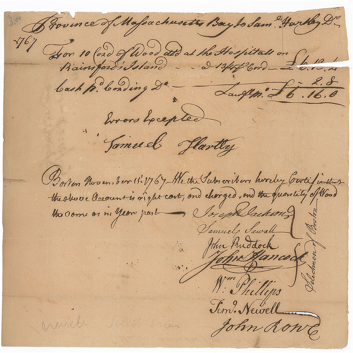 Manuscript DS one page, 7.5 x 7.25, November 15, 1767. A receipt for 10 cords of wood delivered by Samuel Hartley to the hospital on Rainsford’s Island, amounting to £6.16.0, in part, “We the subscribers hereby Certify that the above account is right cost, and charged, and the quantity of Wood the same as in year past.” Signed at the conclusion by Hancock and six other Boston selectmen. In very good condition, with partial separations along some of the intersecting folds and slight ink erosion to one of the other signatures.