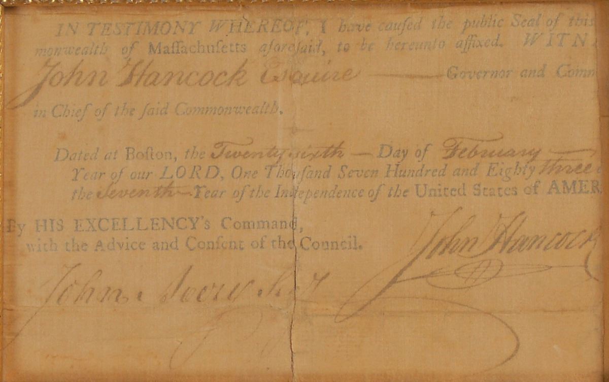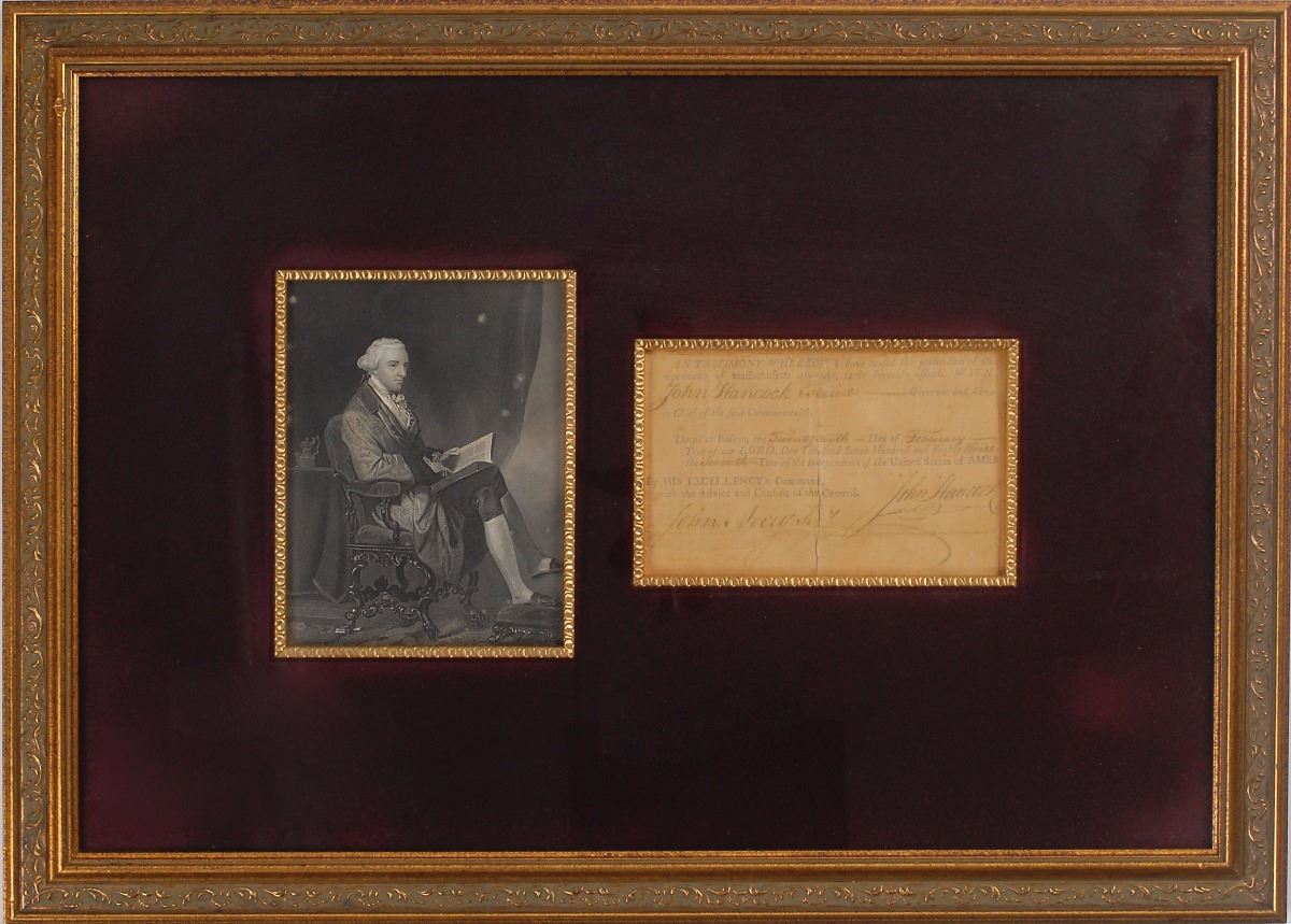 Partial partly-printed DS, one page, 7 x 4.25, February 26, 1783. Conclusion of an official Commonwealth of Massachusetts document, signed by Hancock as governor and countersigned by John Avery as secretary. Cloth-matted and framed with an engraved portrait to an overall size of 25 x 18. Heavily silked on the front for reinforcement, repaired partial separations to intersecting folds, overall toning, and a somewhat musty odor, otherwise very good condition.