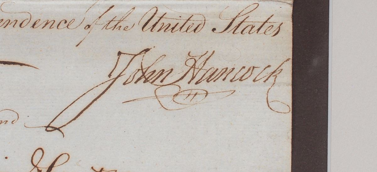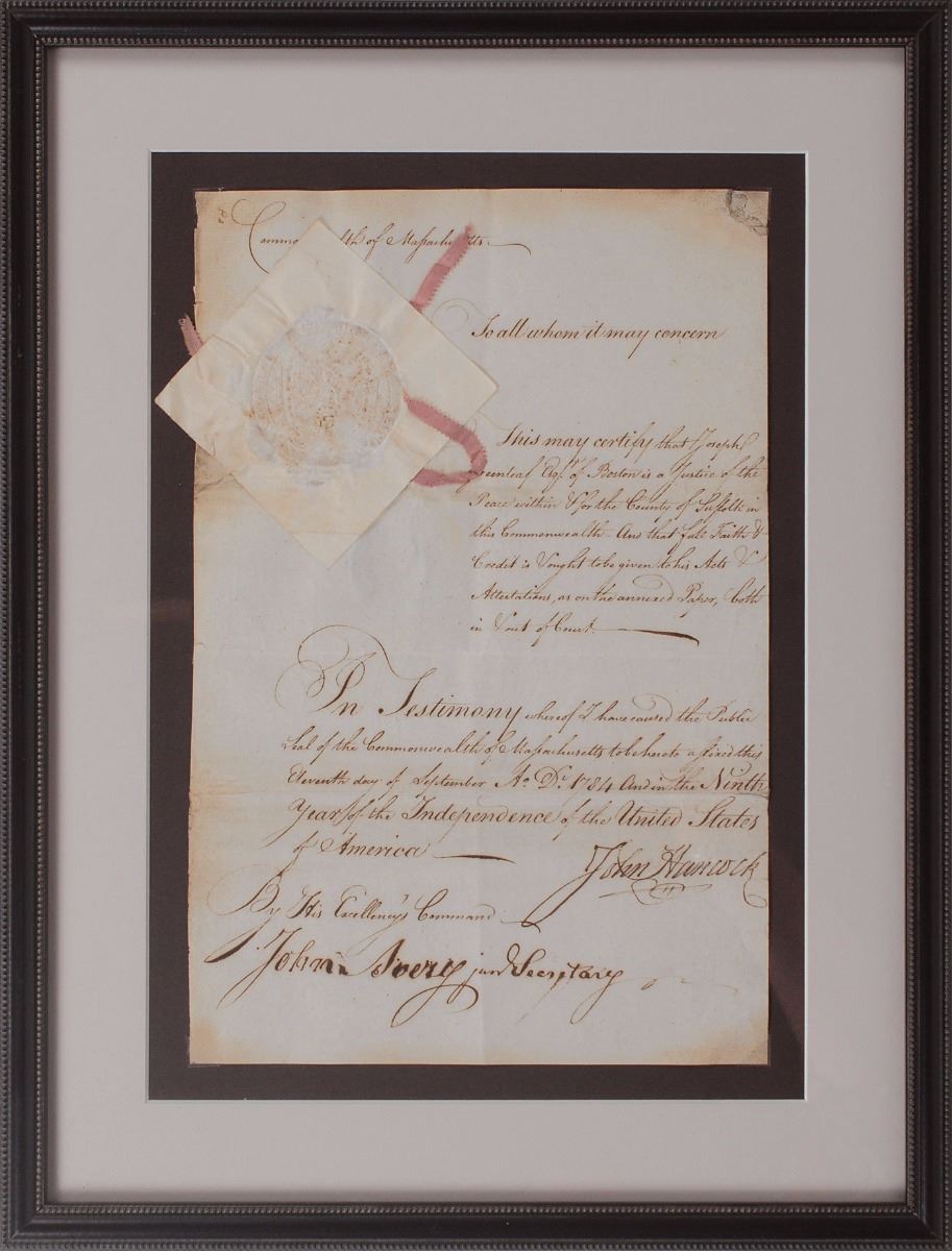 Manuscript DS, one page, 7.75 x 11.75, September 11, 1784. As governor of Massachusetts, Hancock certifies “that Joseph Greenleaf of Boston is a Justice of the Peace within & for the County of Suffolk in the Commonwealth.” Neatly signed at the conclusion by Governor Hancock and countersigned by John Avery as secretary. The white paper seal and ribbon affixed to the upper left remain intact. Handsomely mounted, matted, and framed to an overall size of 12.75 x 16.5. Expected document wear, toning to edges, and scattered soiling, otherwise fine condition. The man being appointed, Joseph Greenleaf, was the brother-in-law of Declaration signer Robert Treat Paine and was himself a politically active writer, contributing to the Massachusetts Spy and the Royal American Magazine. A wonderful official Massachusetts document issued shortly after the Revolution, enhanced by this interesting connection.