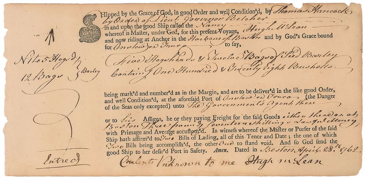 Partly-printed DS filled out in Hancock’s hand but unsigned, one page, 9 x 4.5, April 28, 1762. A bill of landing filled out by Hancock, incorporating his last name in “Thomas Hancock,” countersigned at the conclusion by Hugh McLean as master of the ship Nancy. In part: “Shipped by the Grace of God, in good Order and well Condition’d, by Thos Hancock by order of Lieut. Governor Belcher in and upon the good Ship called the Nancy whereof is Master, under God, for this present Voyage, Hugh McLean and now riding at Anchor in the Harbour of Boston and by God’s Grace bound for Onslow on Truro to say, Five Hogsheads & Twelve Bags of Seed Barley Containg One Hundred & Twenty Eight Bushells being mark’d and number’d as in the Margin, and are to be deliver’d in the like good Order, and well Condition’d, at the aforesaid Port of Onslow on Truro (the Danger of the Seas only excepted) unto The Government’s Agent there or to his Assigns." In fine condition. Upon his graduation from Harvard in 1754, John Hancock entered his uncle Thomas’s business as a clerk. One of Boston merchant Thomas Hancock’s customers was the British government in Nova Scotia to whom he furnished vessels, food, and other supplies.