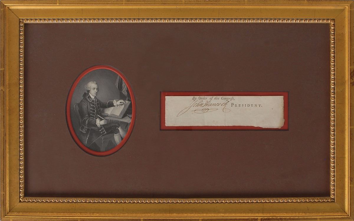 Revolutionary War-dated ink signature, “John Hancock,” on an off-white 6.5 x 1.75 slip clipped from a document signed as Continental Congress president. Matted and framed to an overall size of 19.75 x 12.25. In fine condition.