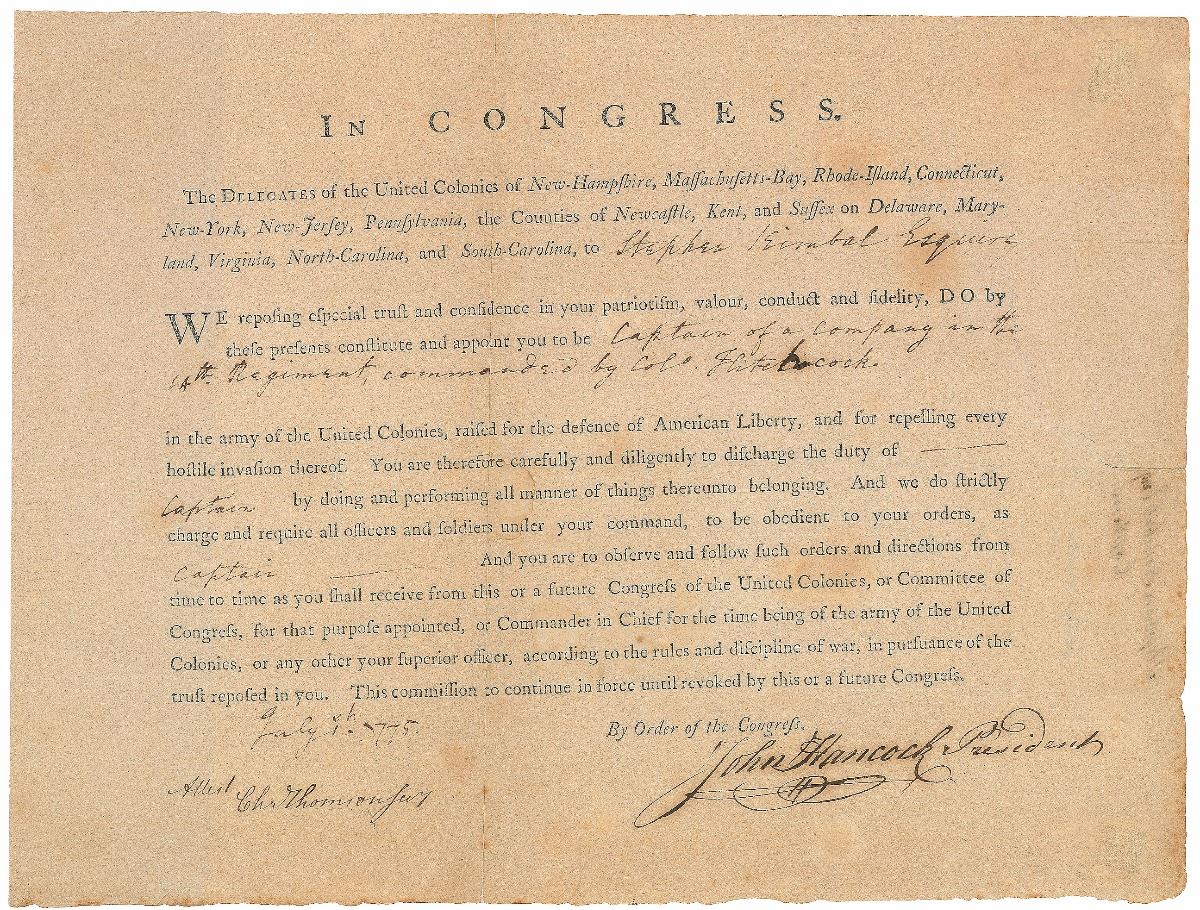 Remarkable partly-printed DS, signed “John Hancock, President,” one page, 13 x 10, July 1, 1775. As president of the Continental Congress, Hancock appoints Stephen Kimbal Esquire as “Captain of a Company in the 14th Regiment, commanded by Col’. Hitchcock in the army of the United Colonies, raised for the defence of American Liberty, and for repelling every hostile invasion thereof.” Prominently signed at the conclusion by Hancock, and countersigned by Secretary Charles Thomson. In fine condition, with professional repairs to a couple of tears, and a few old tape remnants in no way affecting signatures or presentation.